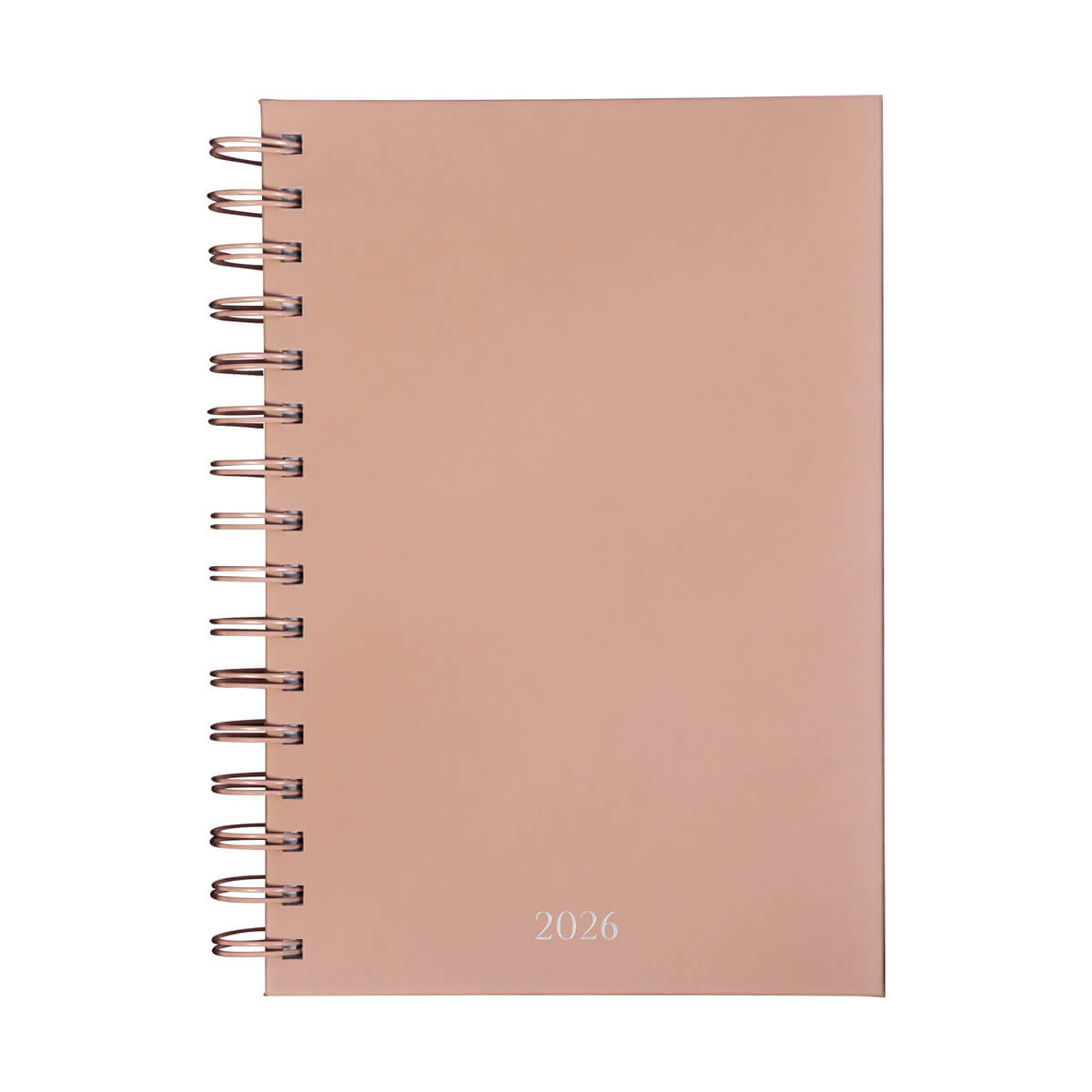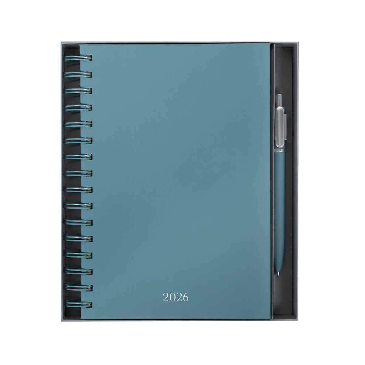 Agenda diaria con 174 hojas. Contiene datos personales, calendarios 2025-2026-2027, planeador 2026, seguimiento de nuevos hábitos y días festivos. Incluye bolígrafo metálico y caja individual tipo regalo.