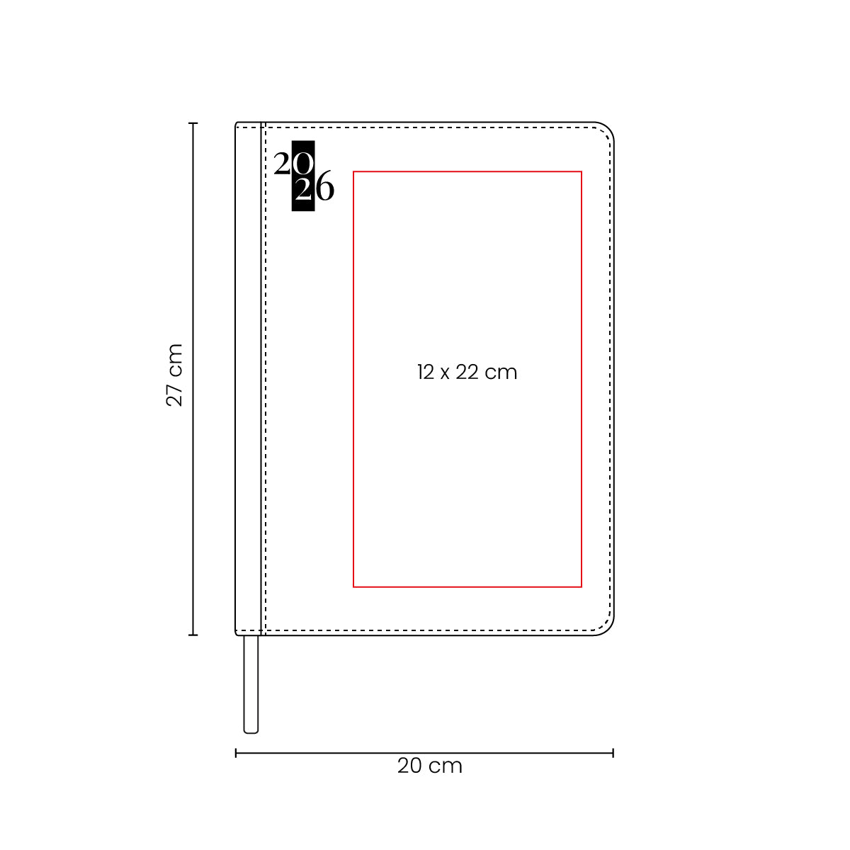 Agenda diaria con 174 hojas. Contiene datos personales, calendarios 2025-2026-2027, planeador 2026, seguimiento de nuevos hábitos y días festivos. Incluye caja individual.