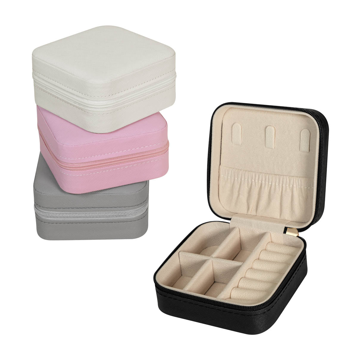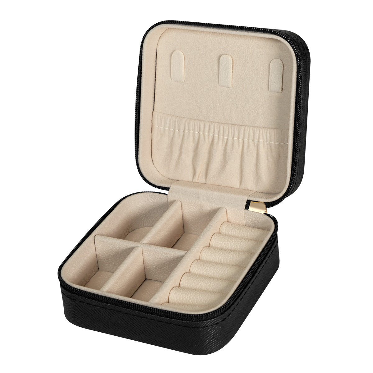 Alhajero con compartimento principal con cierre. Interior tipo terciopelo que protege la joyería de rayones y daños. Incluye 3 ganchos para collares, 6 ranuras para anillos, 1 bolsillo interior con elástico y 4 divisiones.