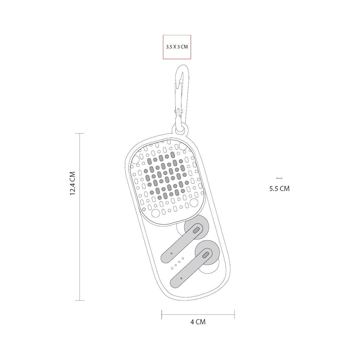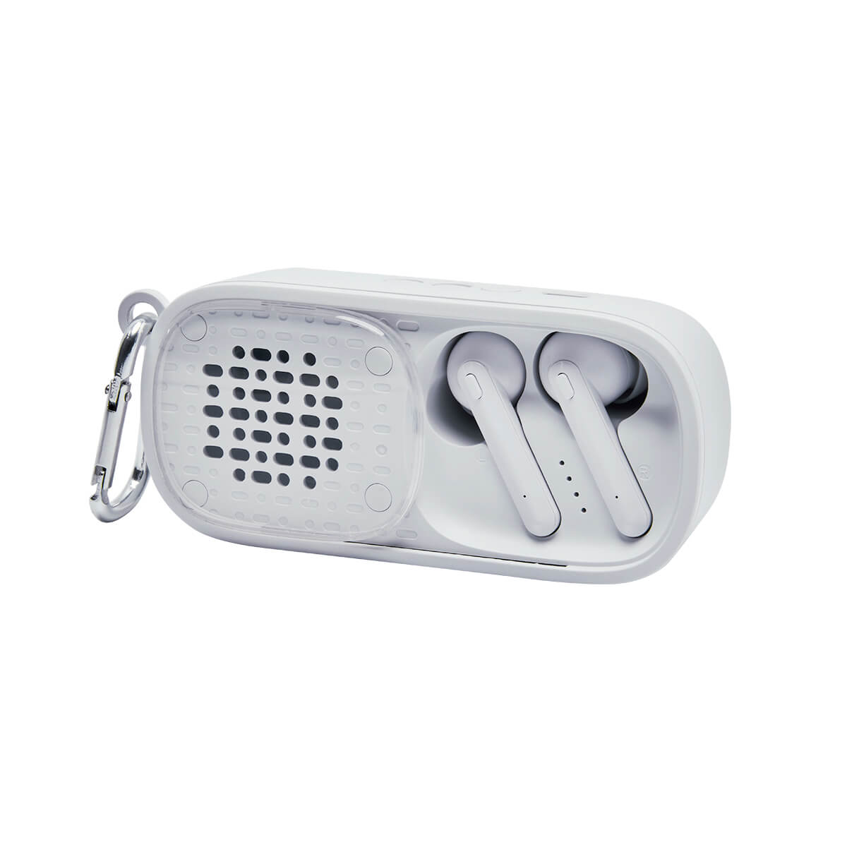 Bocina y audifonos bluetooth con bateria recargable. Reproduccion de musica de 3 hrs aproximadamente. Rango de conexion de 10 metros. Gancho para transportar facilmente. Incluye cable cargador USB.