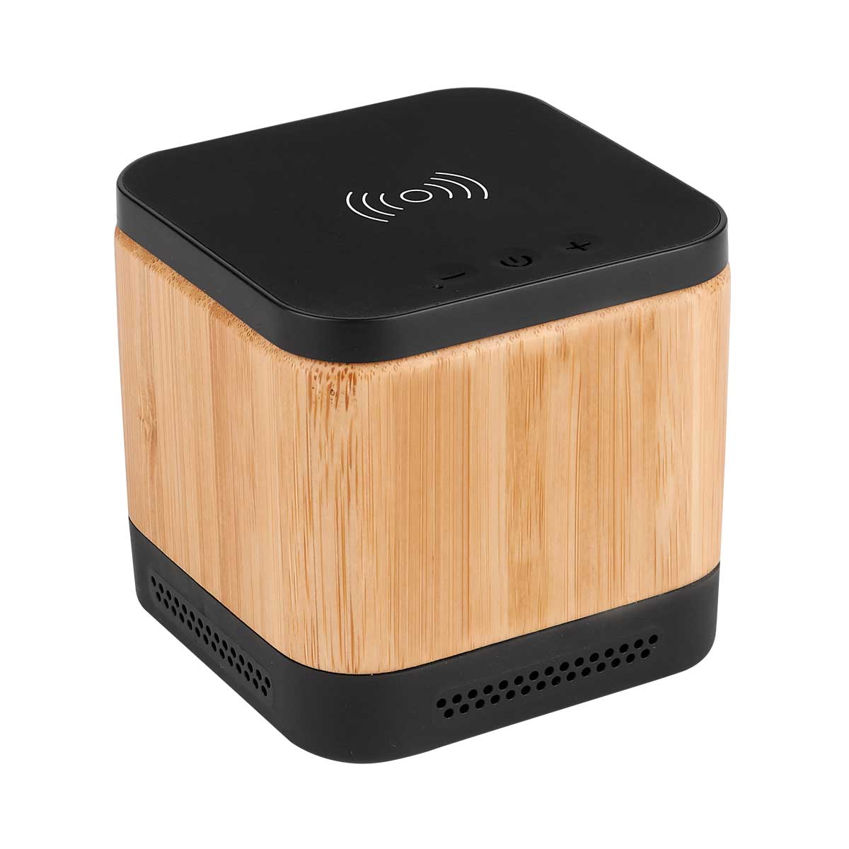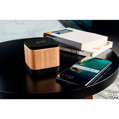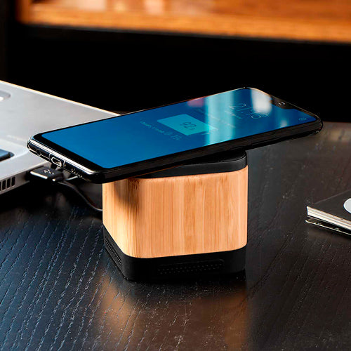 Bocina bluetooth con batería recargable. Preproducción de musica de 2 hrs aproximadamente. Controles integrados de llamadas, volumen y reproducción de audio. Rango de conexión de 10 metros. La base al estar conectada, funciona como cargador inalámbrico de smartphone. Incluye cable cargador USB.