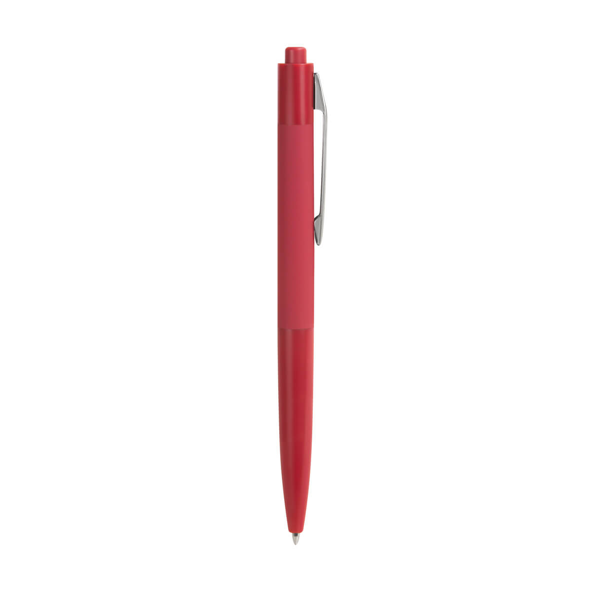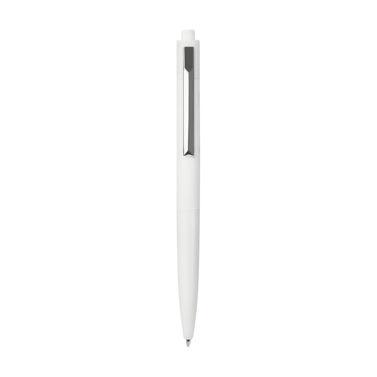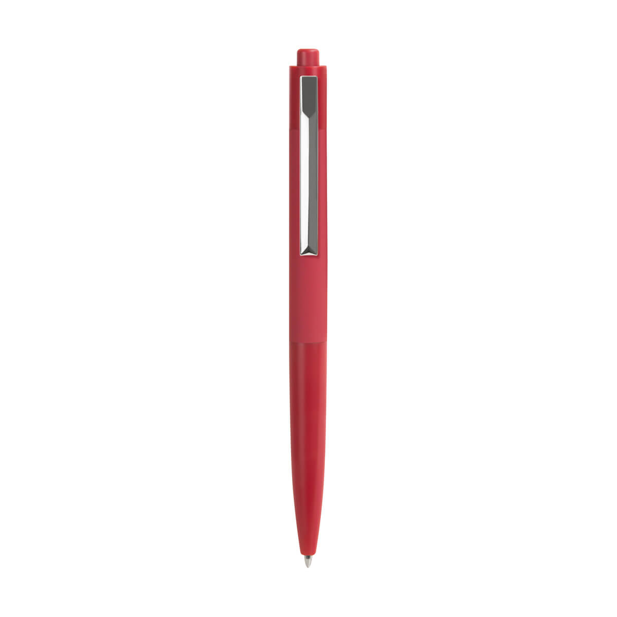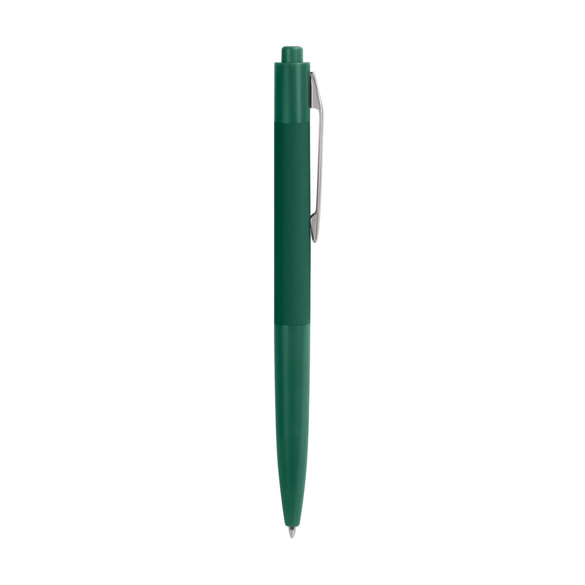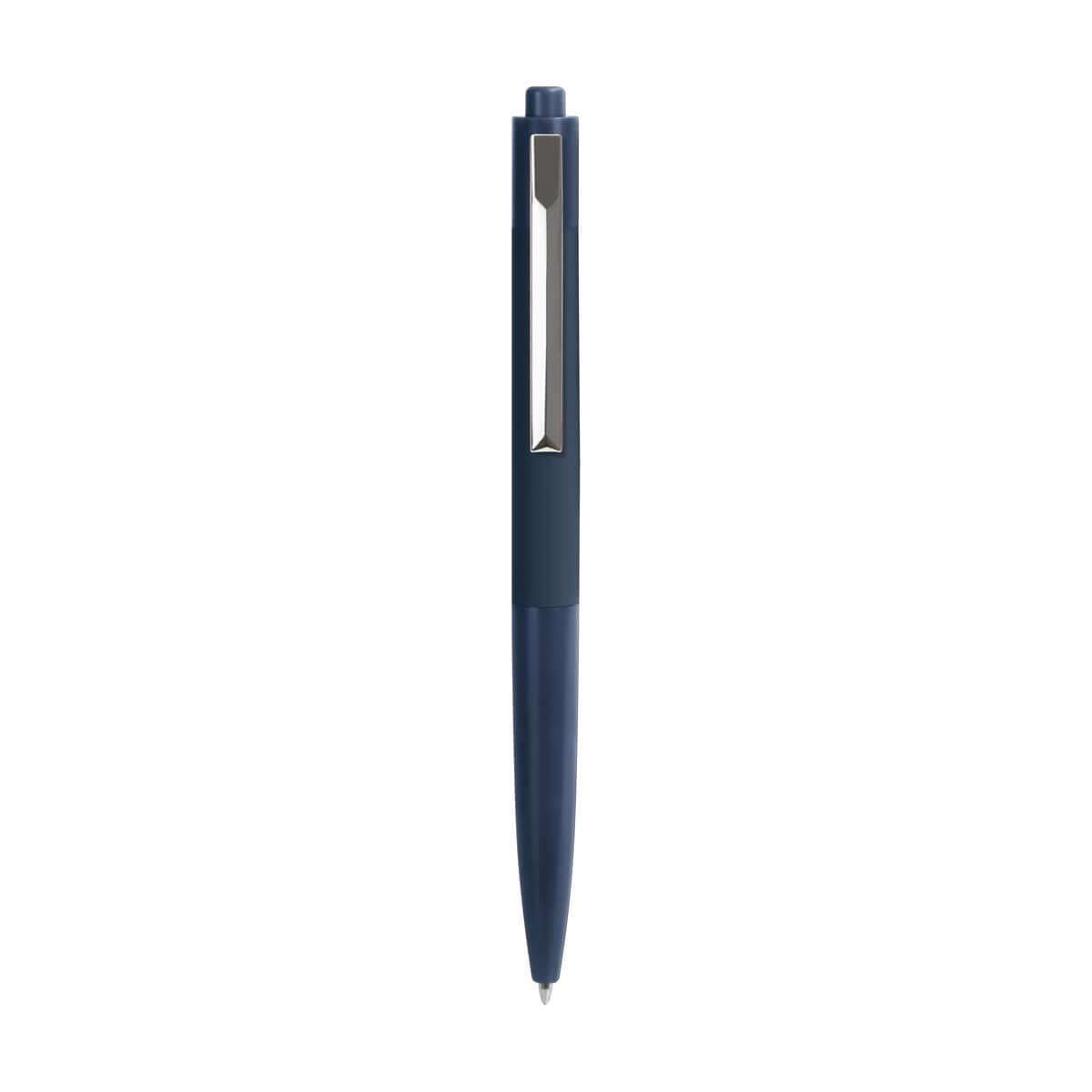Bolígrafo híbrido: mitad metálica y mitad de plástico. Acabado suave al tacto y mecanismo pulsador.