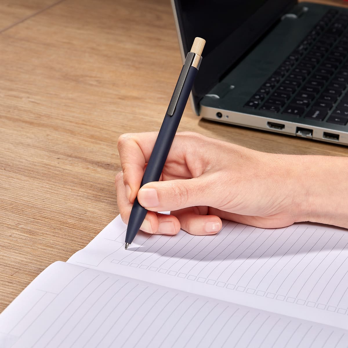 Boligrafo con terminado tipo rubber. Mecanismo pulsador y boton de madera.