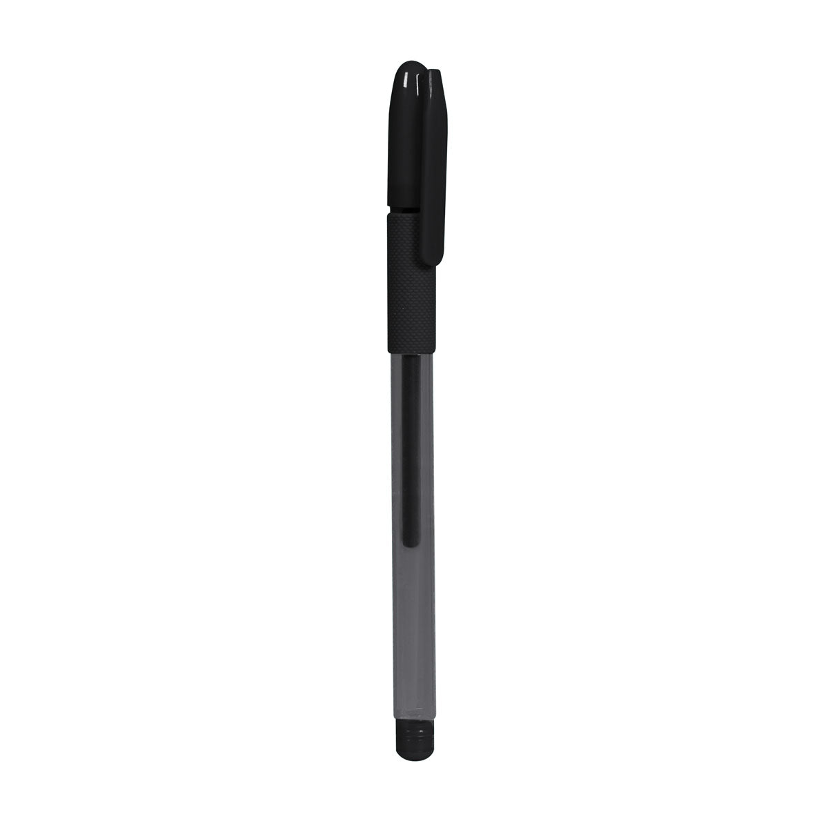Bolígrafo con tapón y grip antiderrapante.