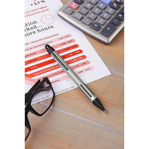 Boligrafo con touch screen y grip antiderrapante. Mecanismo pulsador. Incluye funda.