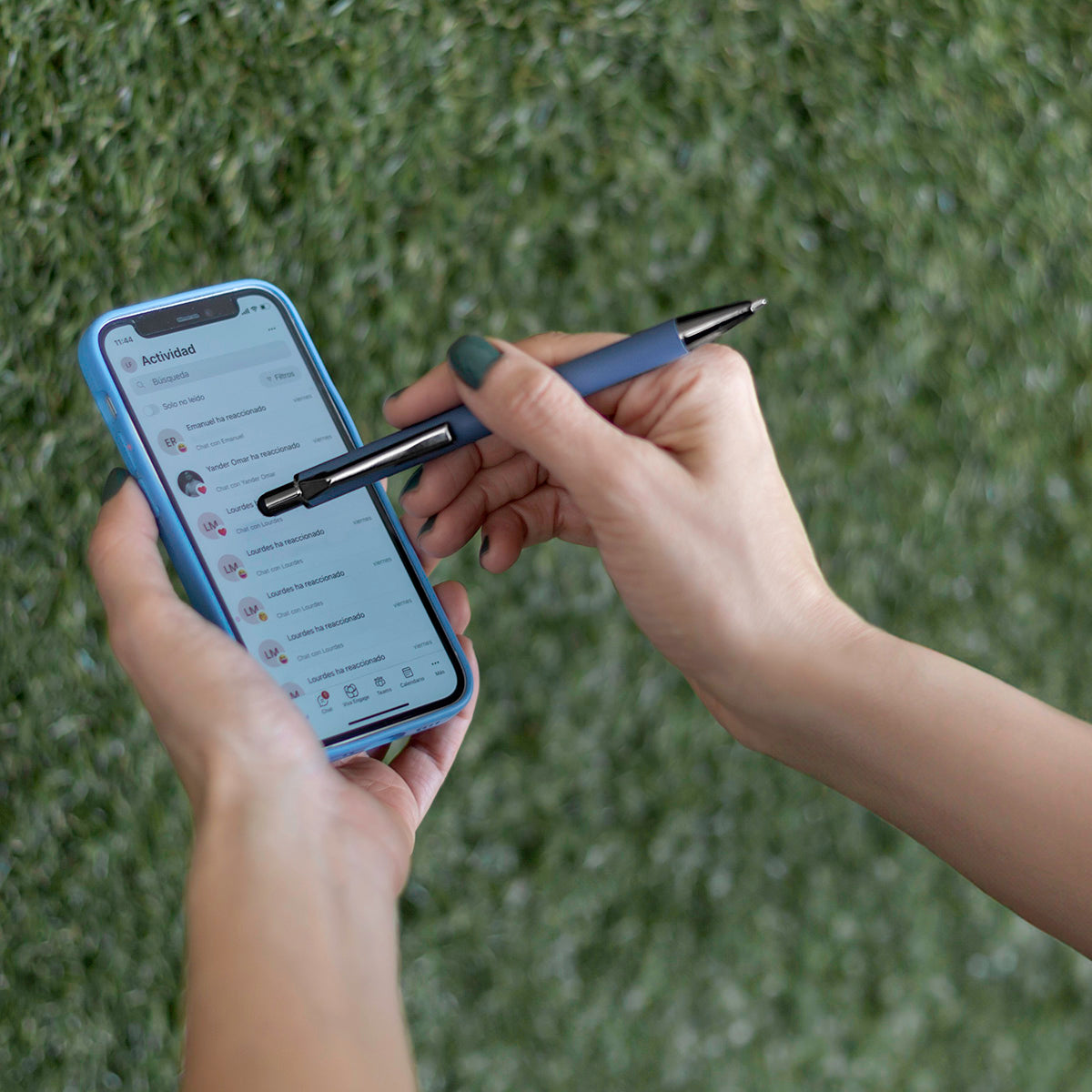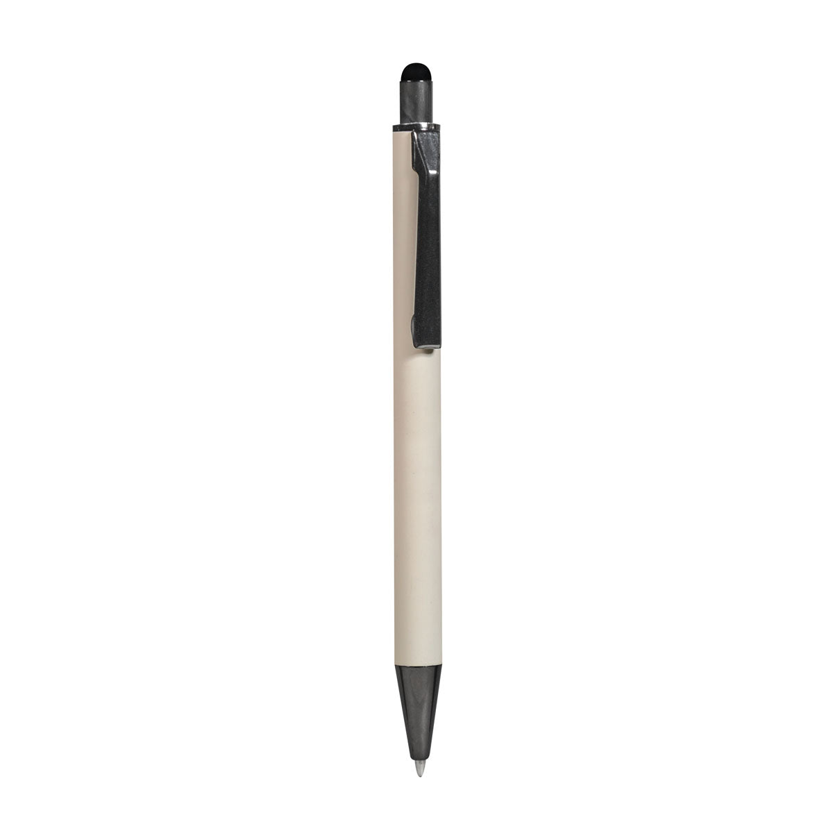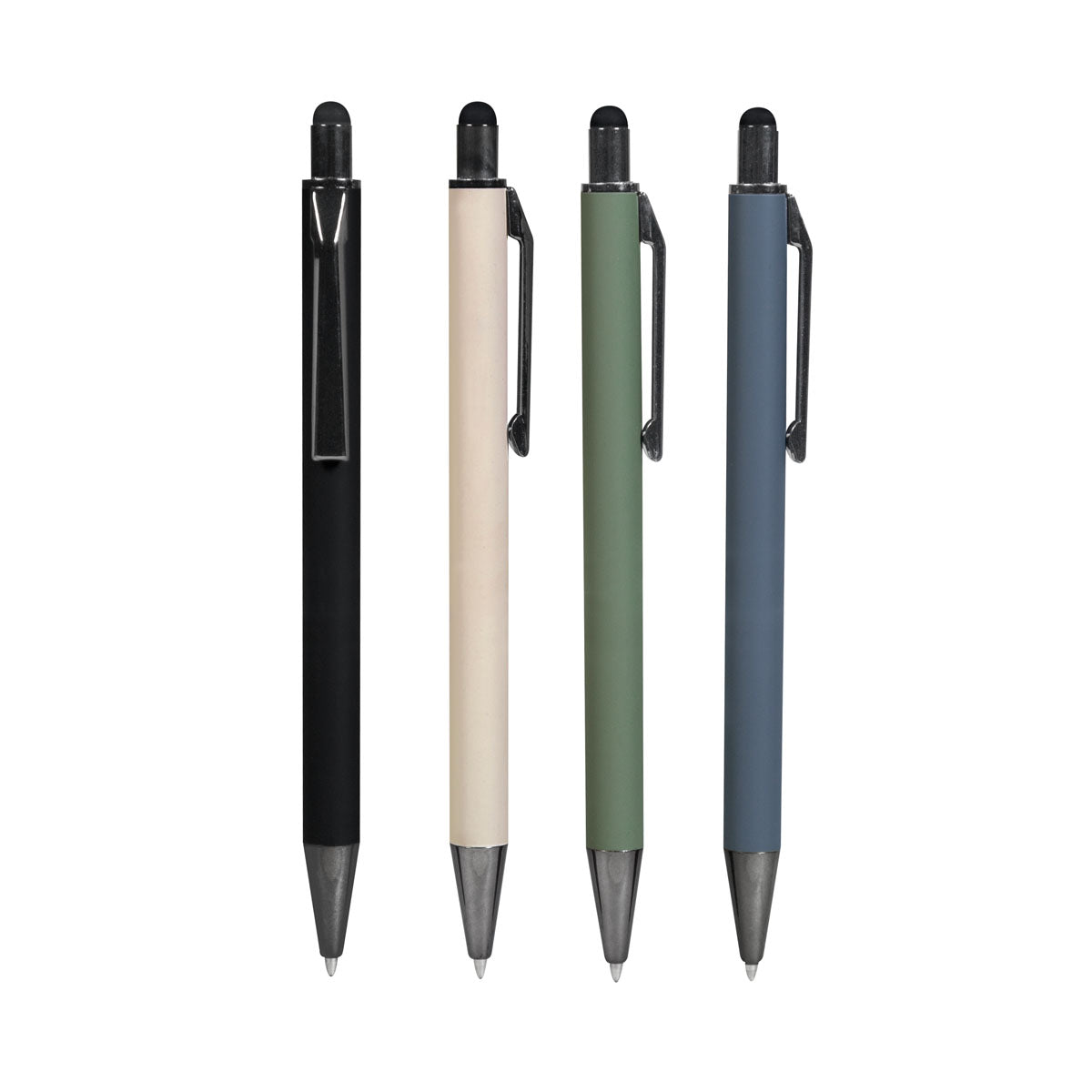 Boligrafo con terminado tipo rubber y touch screen. Mecanismo pulsador. Clip y punta en color metalizado oscuro.