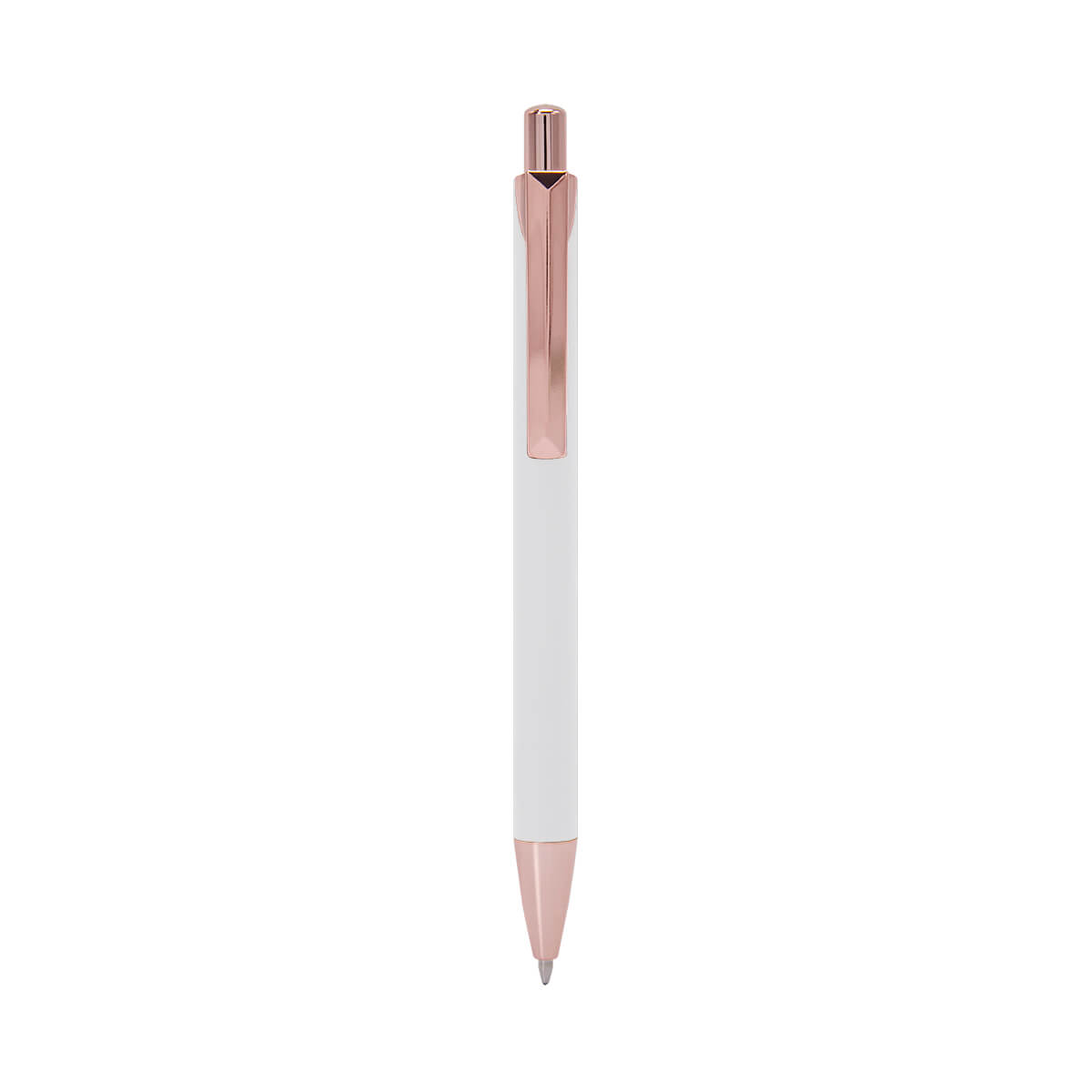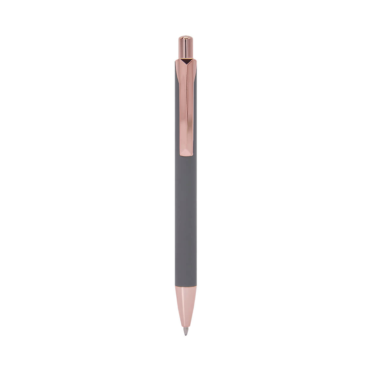 Bolígrafo metálico con terminado tipo rubber. Botón, clip y punta en rose gold. Mecanismo pulsador. Incluye funda.