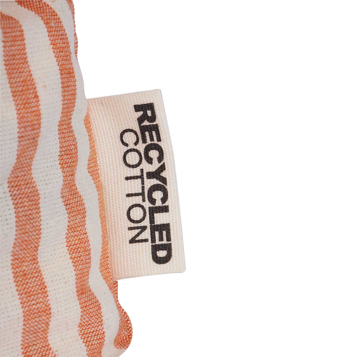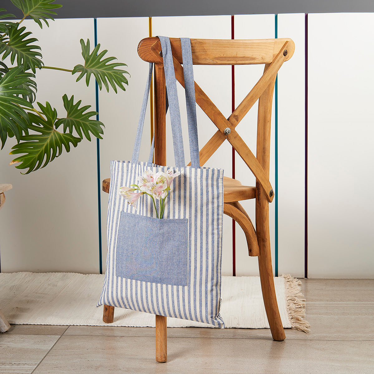 Bolsa ecologica de algodon reciclado. Sin fuelle. Incluye bolsillo frontal. Estampado de rayas.