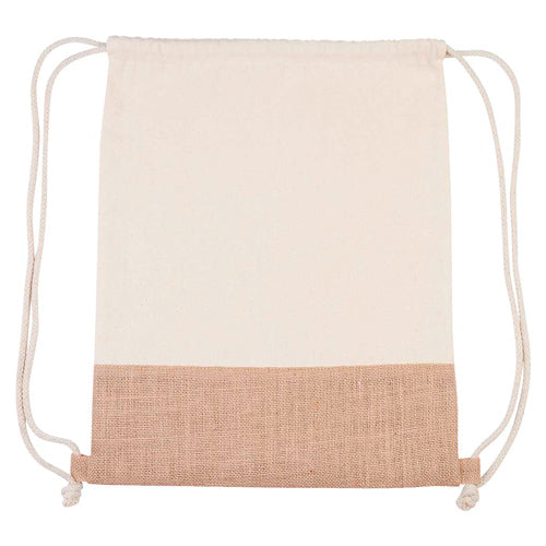 Bolsa-mochila con tirantes de cordon y cerrado de jareta. El yute es un producto natural el cual puede presentar variaciones en tonalidades y en la urdimbre y trama de la tela.