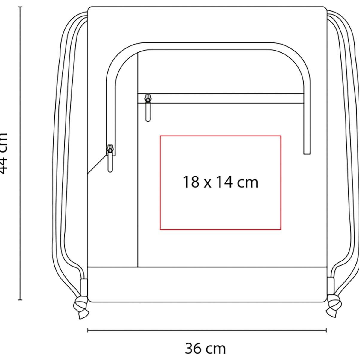 Bolsa-mochila con tirantes gruesos de cordón y cerrado de jareta. Cuenta con 2 bolsas frontales con cierre y compartimento interno plastificado impermeable.