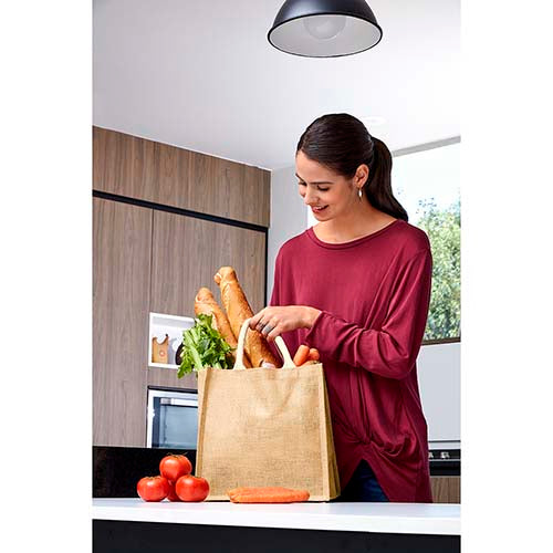 Bolsa con fuelle y asas redondeadas. Interior plastificado. El yute es un producto natural el cual puede presentar variaciones en tonalidades y en la urdimbre y trama de la tela.