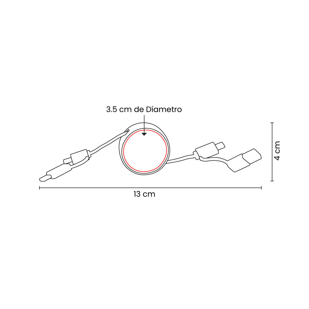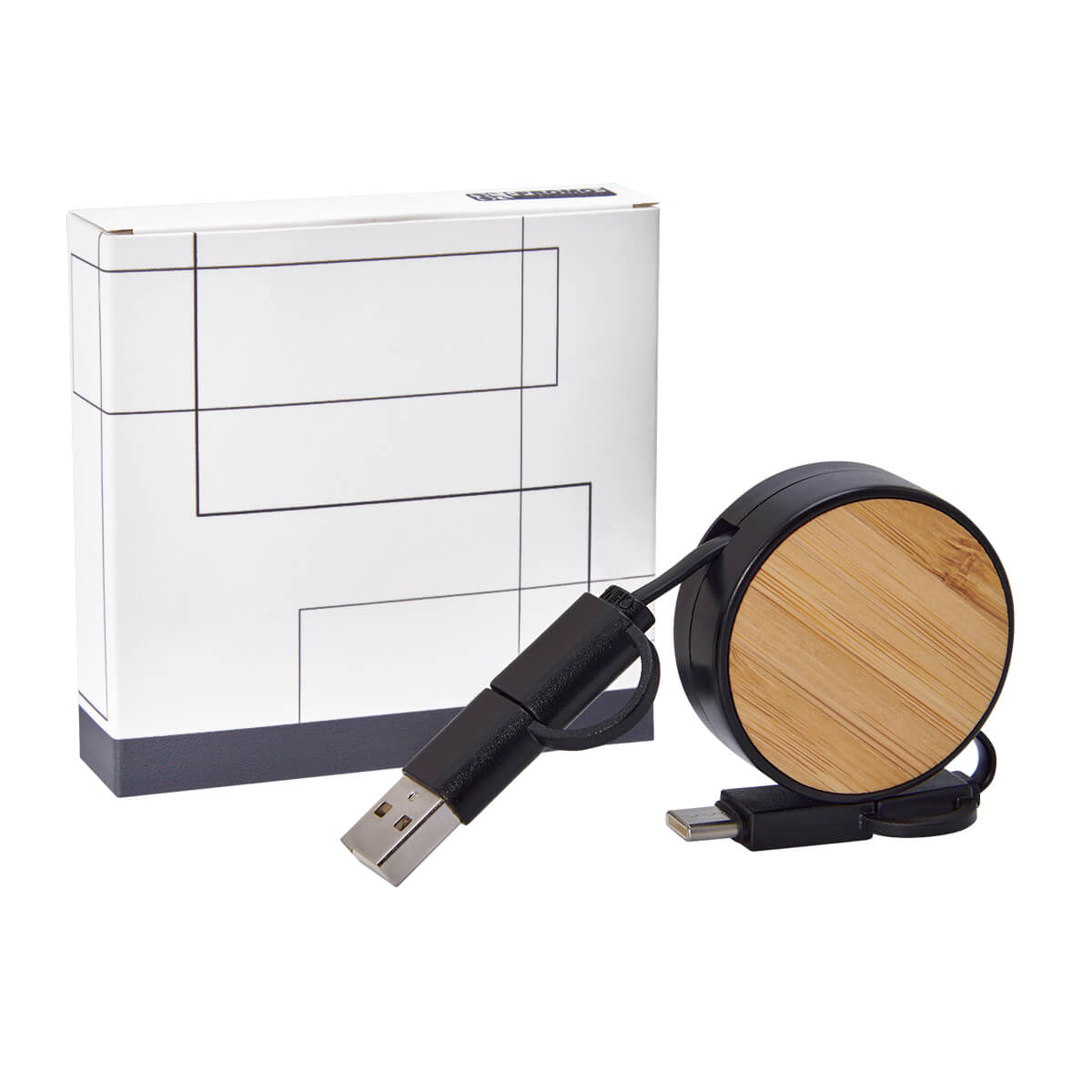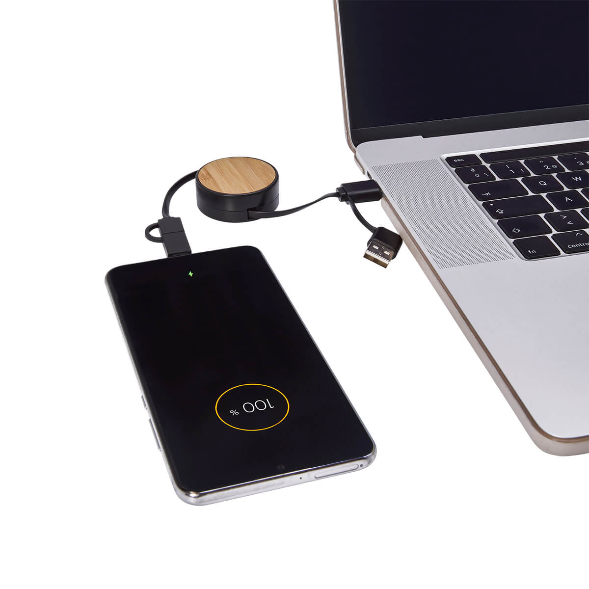 Cable cargador 3 en 1. Incluye conector de entrada USB y tipo C, conector de salida 2 en 1 con micro USB y lightning (8 pines) ademas de tipo C. Largo de cable 80 cm. El bambu es un producto natural el cual puede presentar variaciones en tonalidades y vetas.