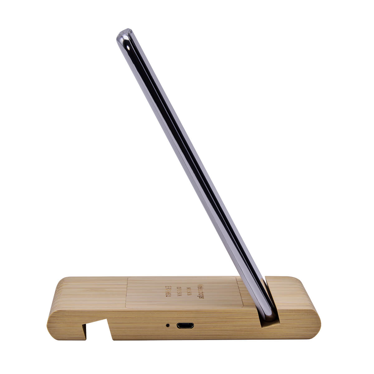 Cargador inalambrico multifuncion con soporte para smartphones y tablets. Incluye LED indicador de carga en proceso y cable con entrada USB y micro USB. Potencia de carga de 5W. Incluye cable cargador. El bambu es un producto natural el cual puede presentar variaciones en tonalidades y vetas.