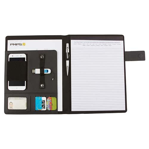 Incluye block de raya tamano A4 con 20 hojas, elastico para boligrafo, compartimento para smartphone y tarjetas. Broche magnetico. No incluye boligrafo.