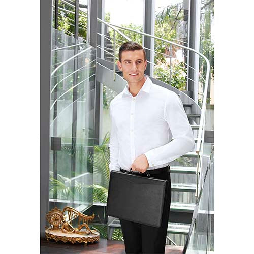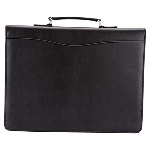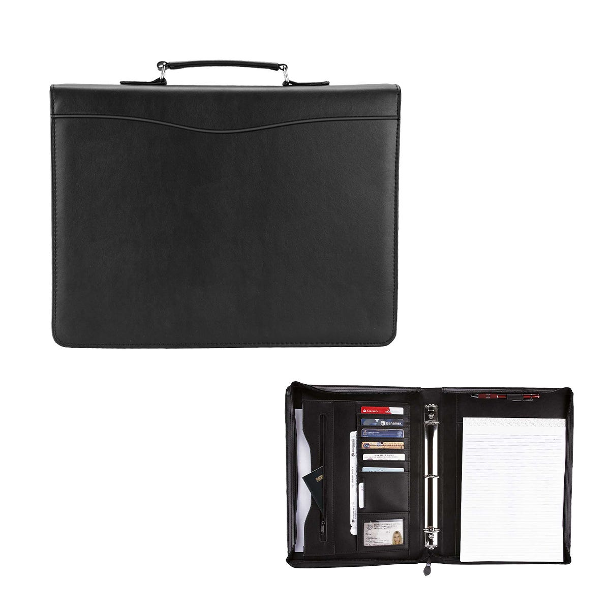 Carpeta portafolio con block de raya tamaño A4 con 20 hojas. Incluye compartimento para bolígrafo, tarjetas y pasaporte. Arillo de 1.25 pulgadas. No incluye bolígrafo.