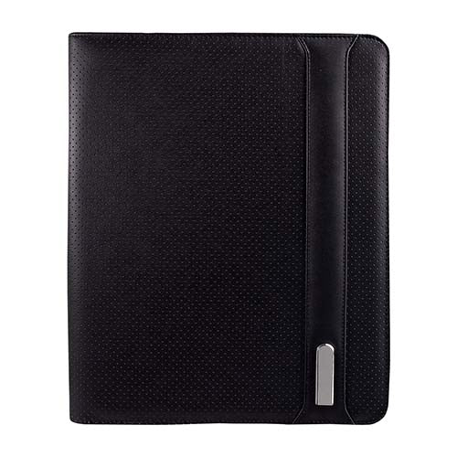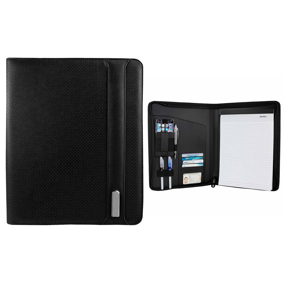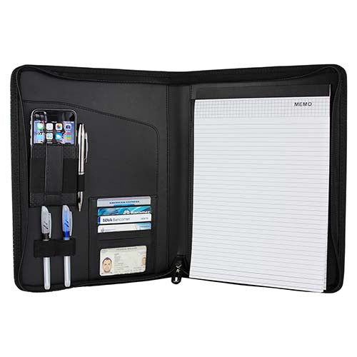 Carpeta con cierre y placa metálica. Incluye block de raya tamaño A4 con 20 hojas. Incluye elástico para bolígrafo, compartimento para smartphone y tarjetas. No incluye bolígrafo.
