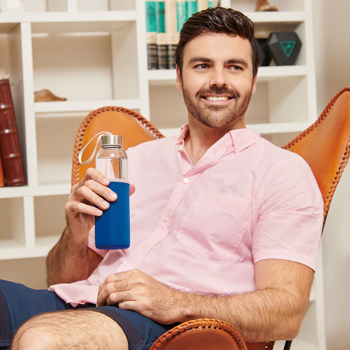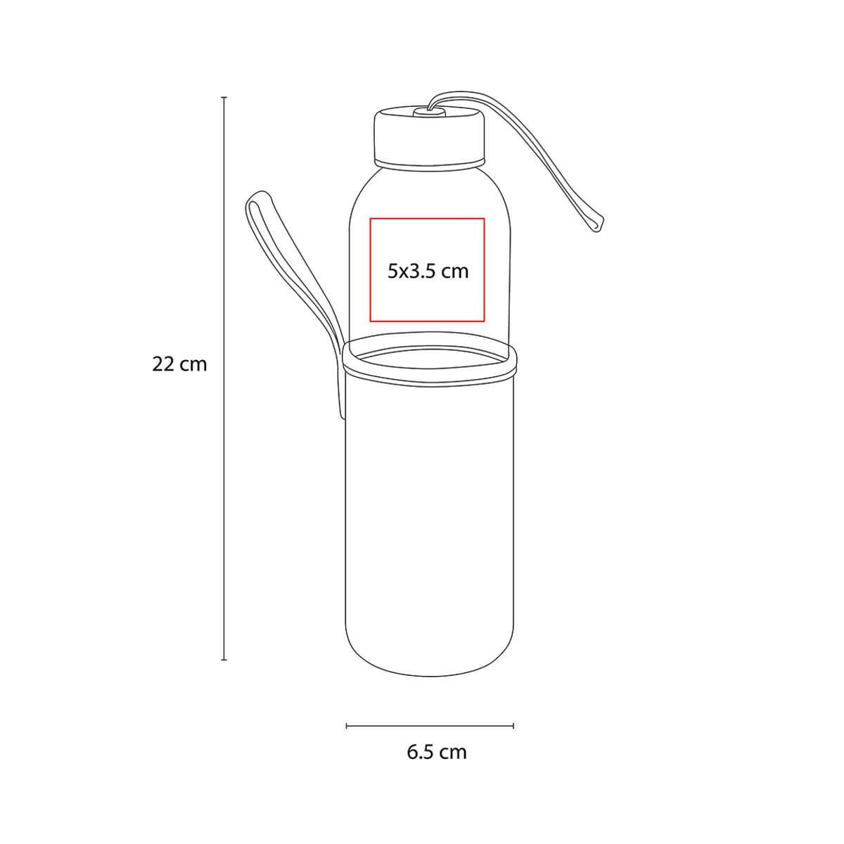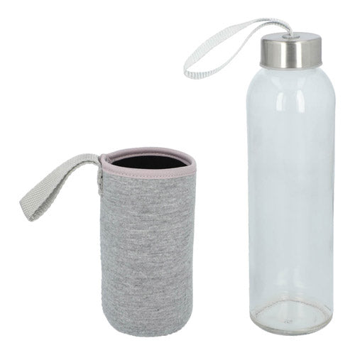 Cilindro de vidrio con tapa metalica de rosca con jareta de tela y funda removible de neopreno con asa que no permite transferir calor de las manos o del ambiente a la bebida. Incluye caja individual.