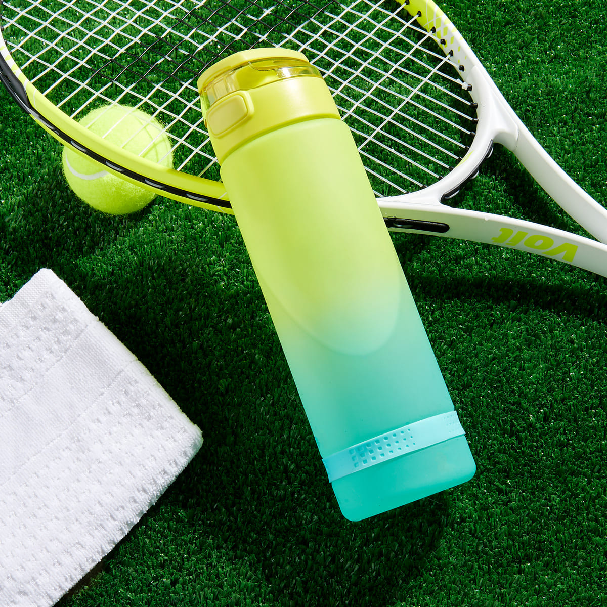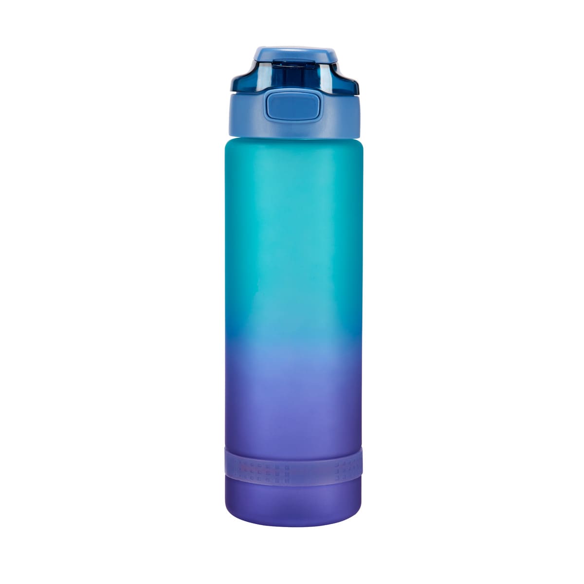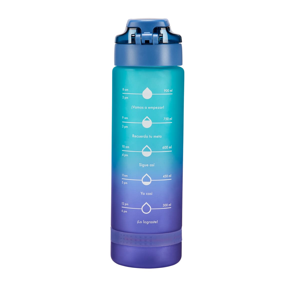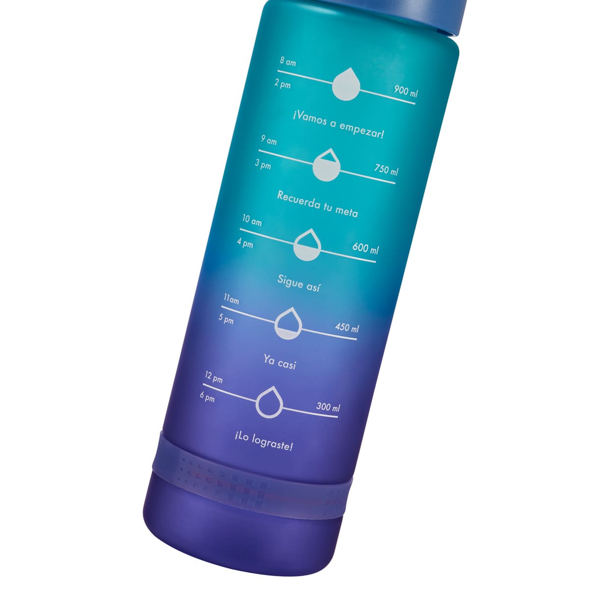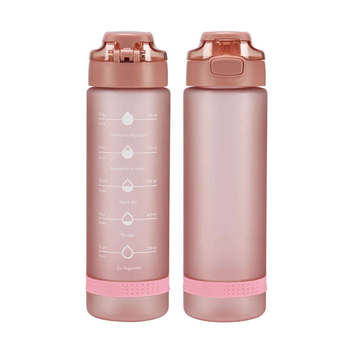 Tapa de plastico con cierre de rosca hermetica y boquilla. Sobretapa push con boton y asa plegable. Cuerpo con terminado tipo rubber, suave al tacto. Cuenta con un detalle de silicon en la parte inferior. Incluye marcador de mililitros y horas lo que te permite medir facilmente la cantidad de agua que bebes a lo largo del dia y llevar un control de tu hidratacion. Incluye caja individual.