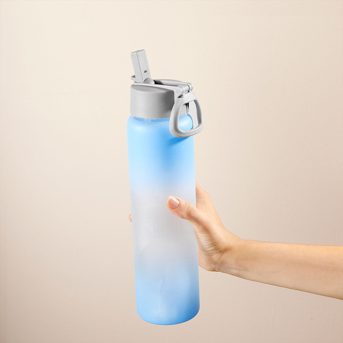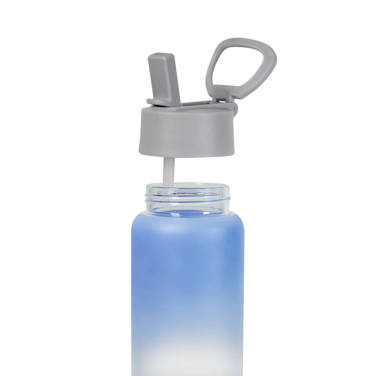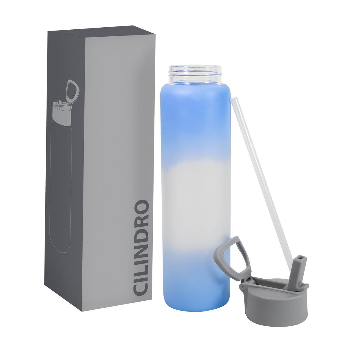 Cilindro de vidrio con terminado frosty y un recubrimiento especial para sublimar. Tapa de plástico con cierre de rosca asa y popote retráctil. Incluye caja individual.