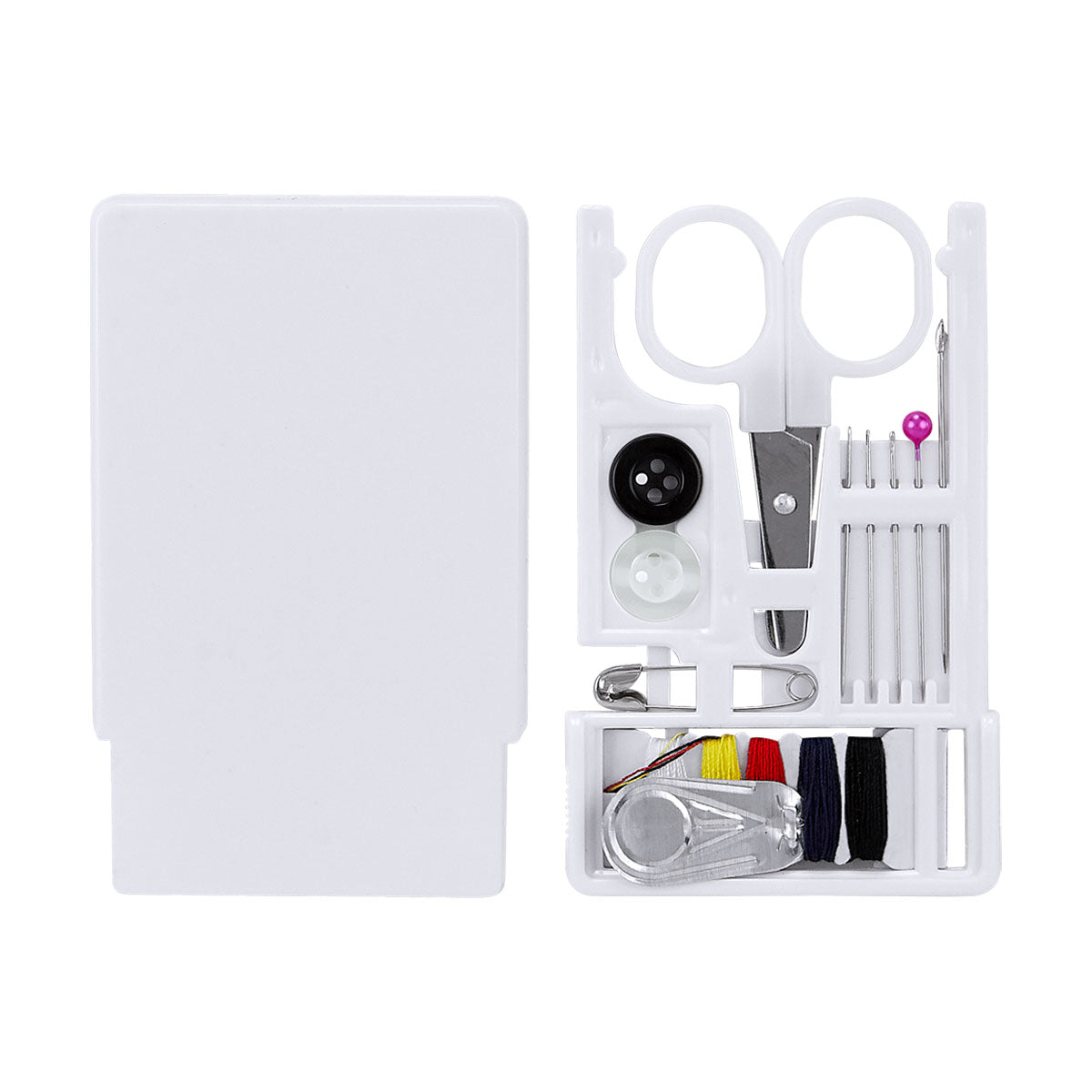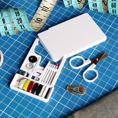 Tapa deslizable. Incluye tijeras, botones, ensartador de aguja, alfiler, hilo, agujas y seguro.