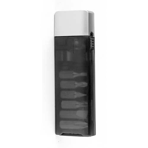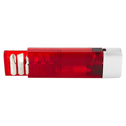 Contiene desarmador con 6 puntas diferentes e intercambiables, lámpara y clip. Incluye 4 baterías de botón.
