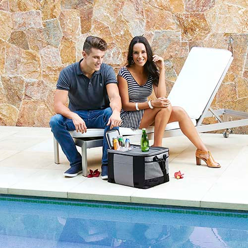 Hielera plegable con interior plastificado impermeable, cubierta de plastico con ventana para facil acceso a interior, bolsas laterales de red y correa ajustable. Capacidad para 36 latas.