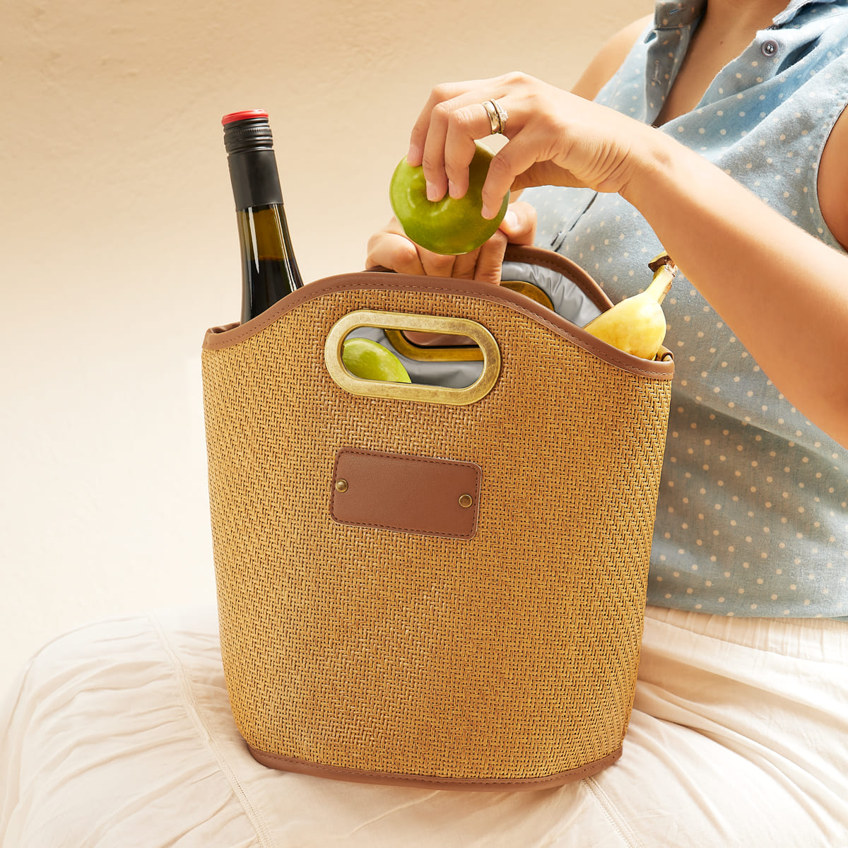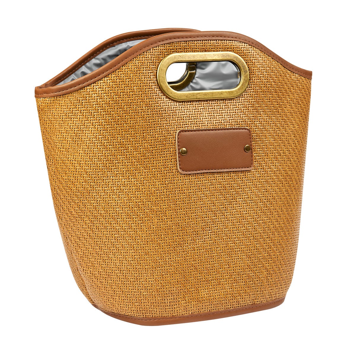 Hielera tipo bolsa con interior sellado plastificado. Compartimento principal con diseño abierto. Asas con marco de metal. Capacidad para 12 latas.