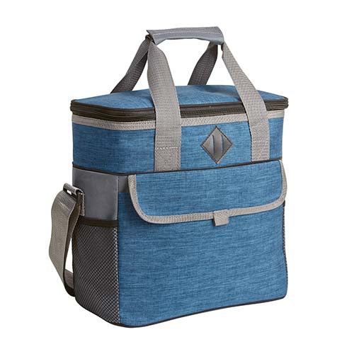Interior plastificado impermeable. Bolsa principal con cierre, bolsa frontal con velcro. 2 Bolsas laterales de red y 2 asas superiores para agarre. Capacidad para 12 latas.