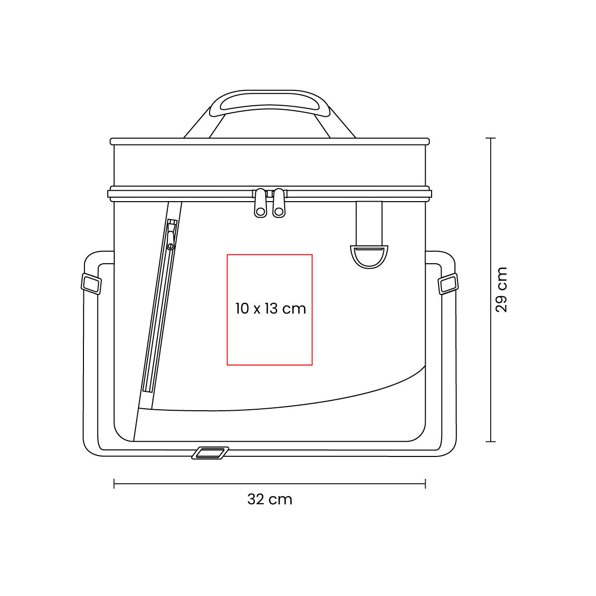 Interior y exterior plastificado impermeable. Bolsa principal y bolsillo frontal con cierre. Al frente cuenta con accesorio para colgar llaves o destapador. Incluye asa de mano y correa larga ajustable. Capacidad para 16 latas.