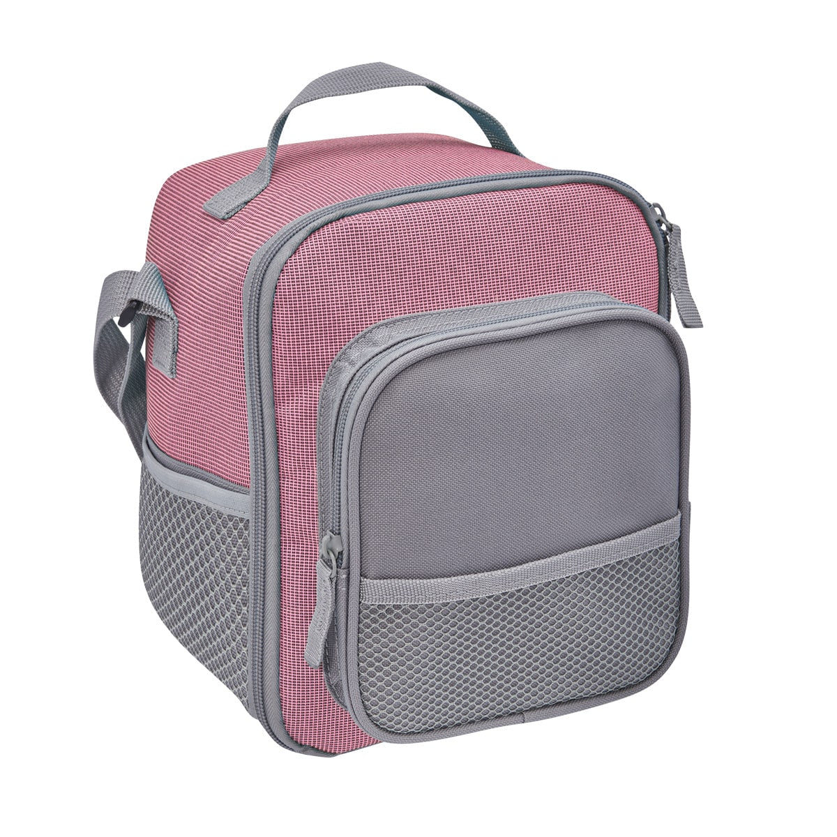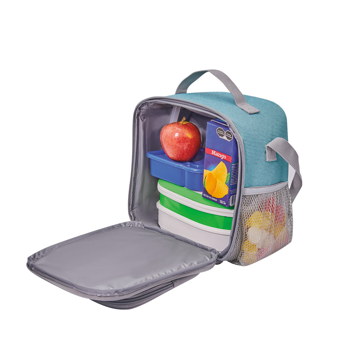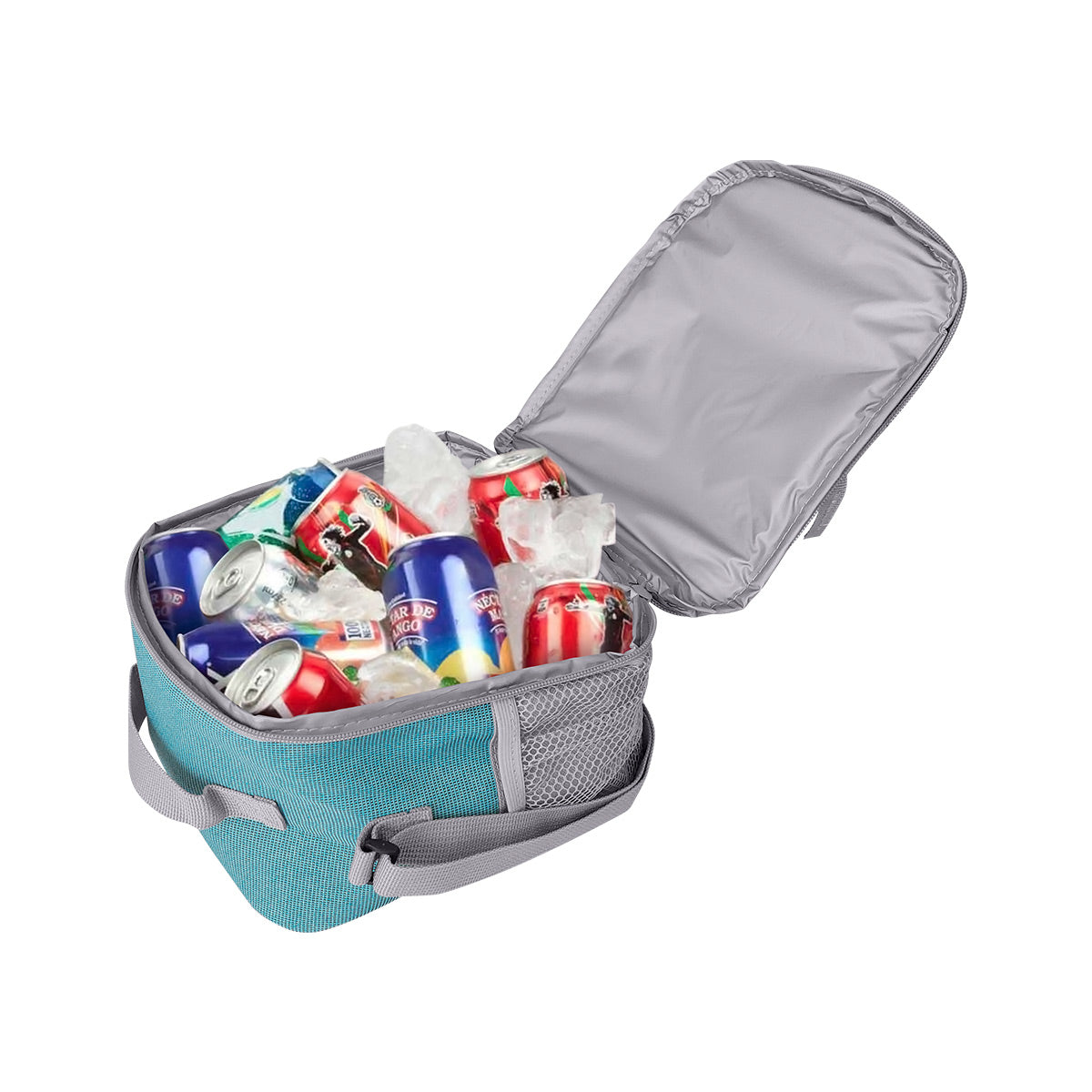 Interior plastificado resistente al agua. Compartimento principal con cierre. Bolsillo frontal con cierre y malla. Dos bolsillos laterales de malla. Asa superior y asa larga ajustable. Capacidad de 8 latas.