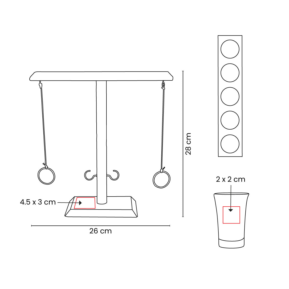 Lleva la diversion a otro nivel con este emocionante juego de destreza para dos jugadores. El objetivo es simple pero desafiante: cada jugador debe balancear su aro e intentar fijarlo en el gancho. Si lo logra, el shot se movera hacia su oponente. El jugador que no pueda evitar que el shot salga de la base debera beber un shot. Perfecto para reuniones y fiestas, este juego combina habilidad, emocion y risas en cada ronda. Incluye juego con dos aros, base y shot. La madera es un producto natural el cual puede presentar variaciones en tonalidades y vetas.