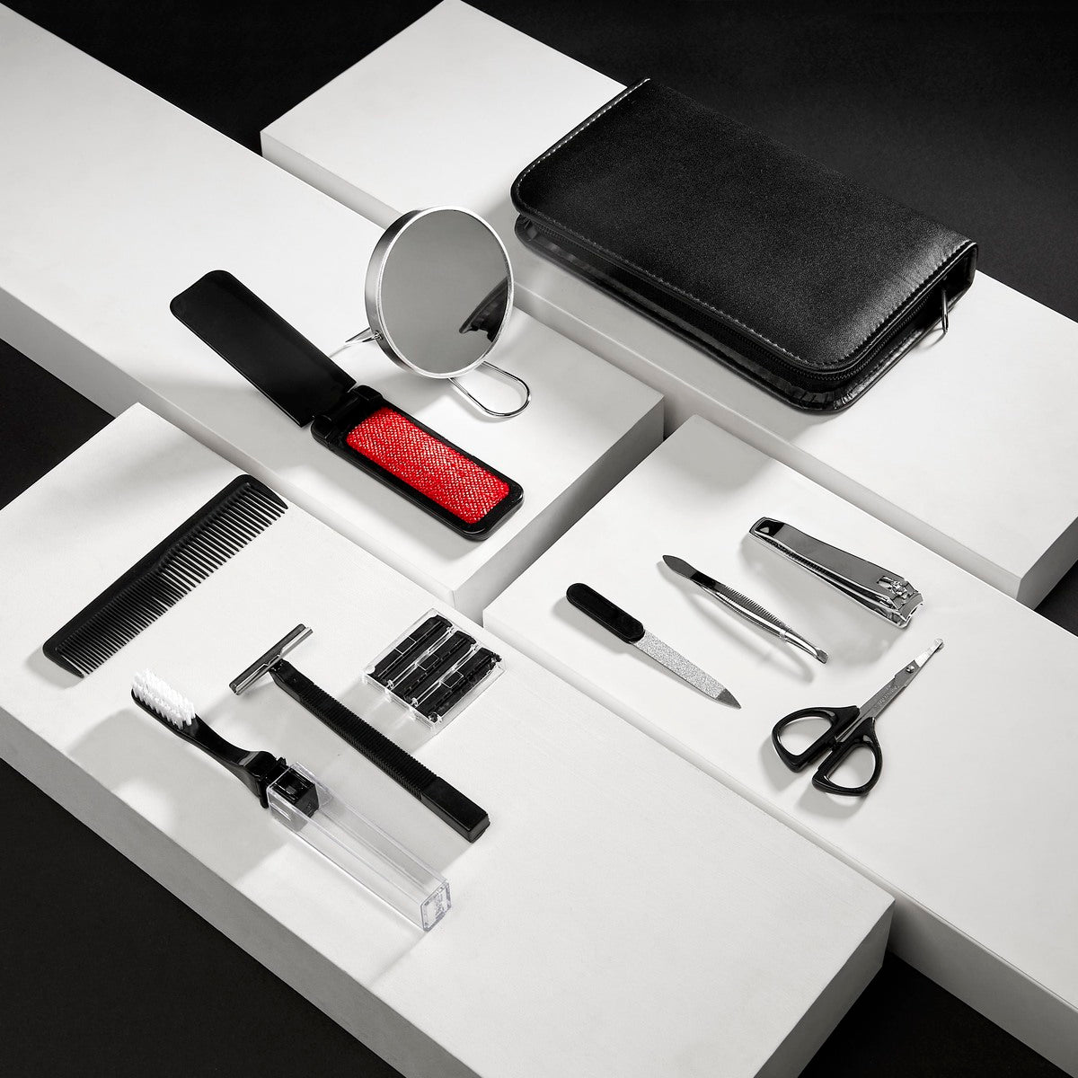 Set de cuidado personal. Ideal para tus viajes, mantente impecable en cualquier momento. Incluye los siguientes 10 accesorios: espejo, lima, cortaunas, pinzas, tijeras, peine, cepillo dental, rastrillo con 3 navajas de repuesto y un calzador plegable con limpiador de calzado.
