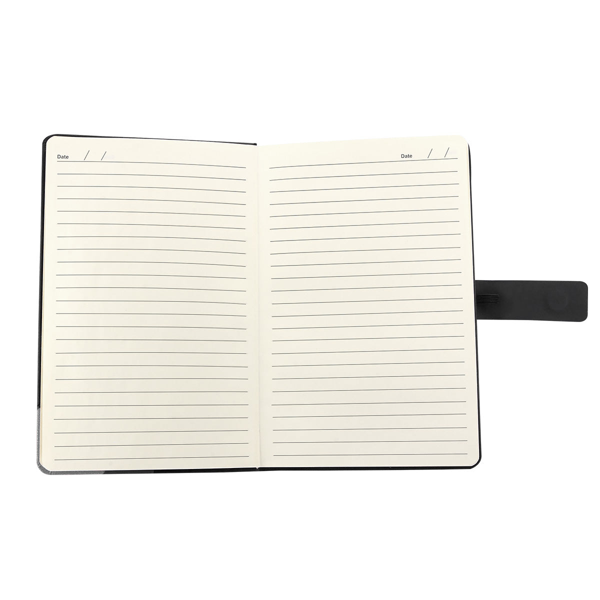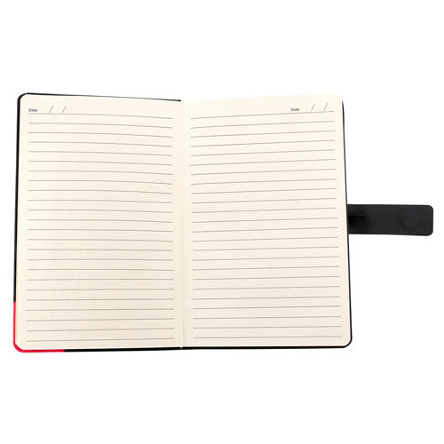 Libreta con 80 hojas de raya. Incluye elástico para bolígrafo, broche imantado para cerrar y placa para grabado.