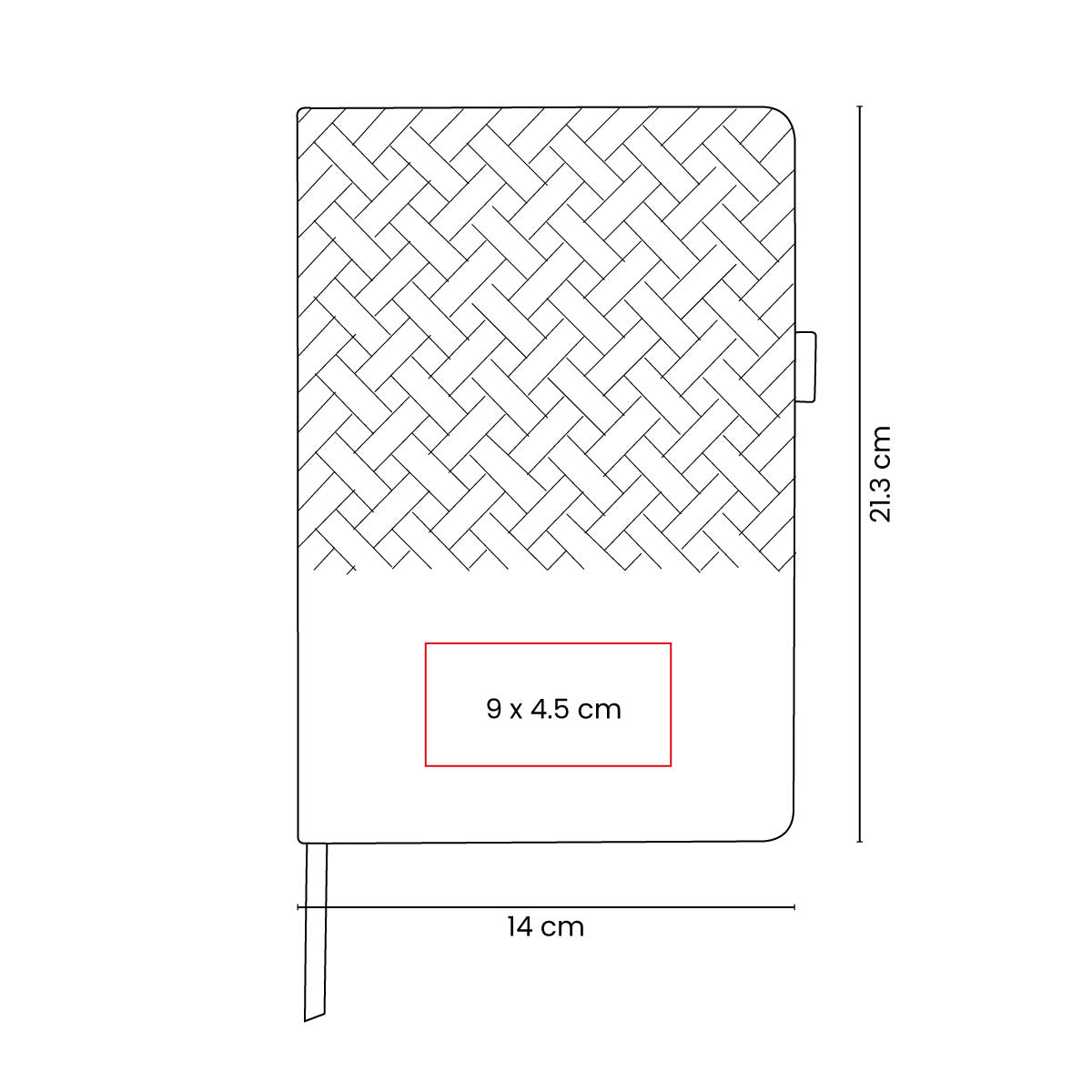 Libreta con 80 hojas a raya. Cubierta rígida con dos tipos de textura: una con diseño en termograbado y otra lisa. Incluye elástico para bolígrafo y separador de hojas. Bolígrafo no incluido.