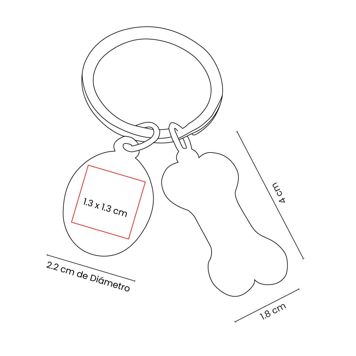 Llavero metalico con diseno en forma de hueso y placa redonda para grabado. Personalizalo con el nombre de tu mascota, una fecha especial o cualquier texto que desees. Ademas de mantener tus llaves organizadas, tambien te permite recordar a tus mascotas.