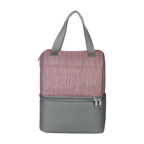 Interior plastificado. Compartimento superior e inferior con cierre y bolsillo frontal. Cuenta con 2 asas de agarre superior. Capacidad para 12 latas.