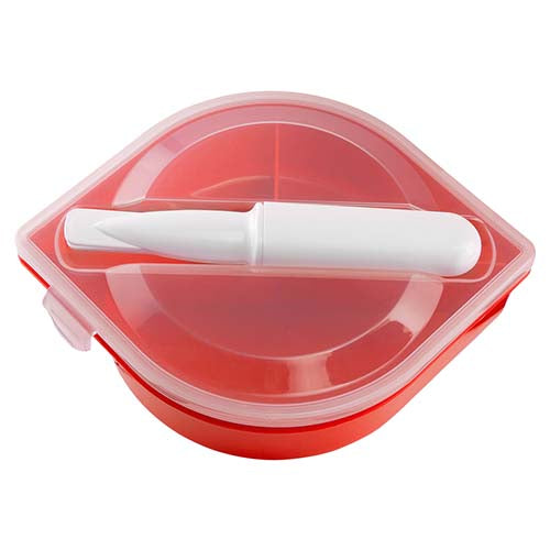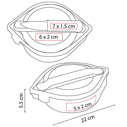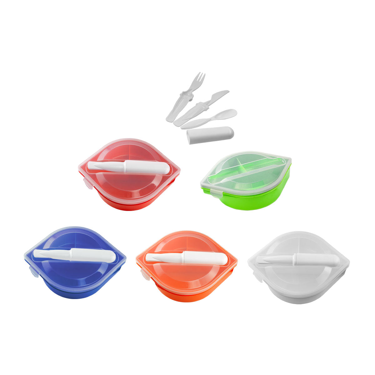Lonchera con 3 compartimentos en el interior. Incluye portacubiertos con cuchara, tenedor y cuchillo. Tapadera con pestanas para un mejor cerrado. No recomendado para microondas.