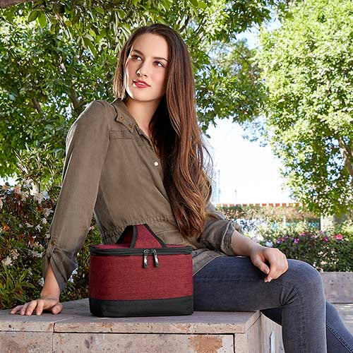 Lonchera con interior plastificado, bolsa principal con cierre y asa de agarre superior. Capacidad para 6 latas.