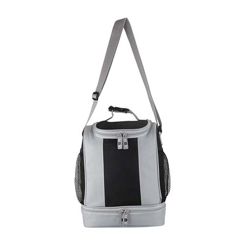 Interior plastificado. Cuenta con compartimentos superior e inferior con cierre. Incluye bolsas laterales de red, asa con broche y correa ajustable. Capacidad para 5 latas.