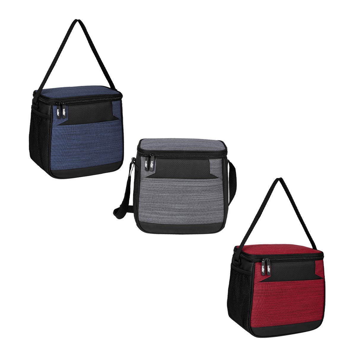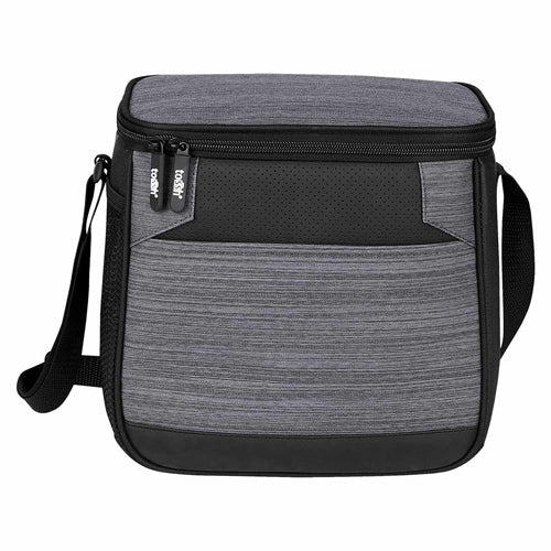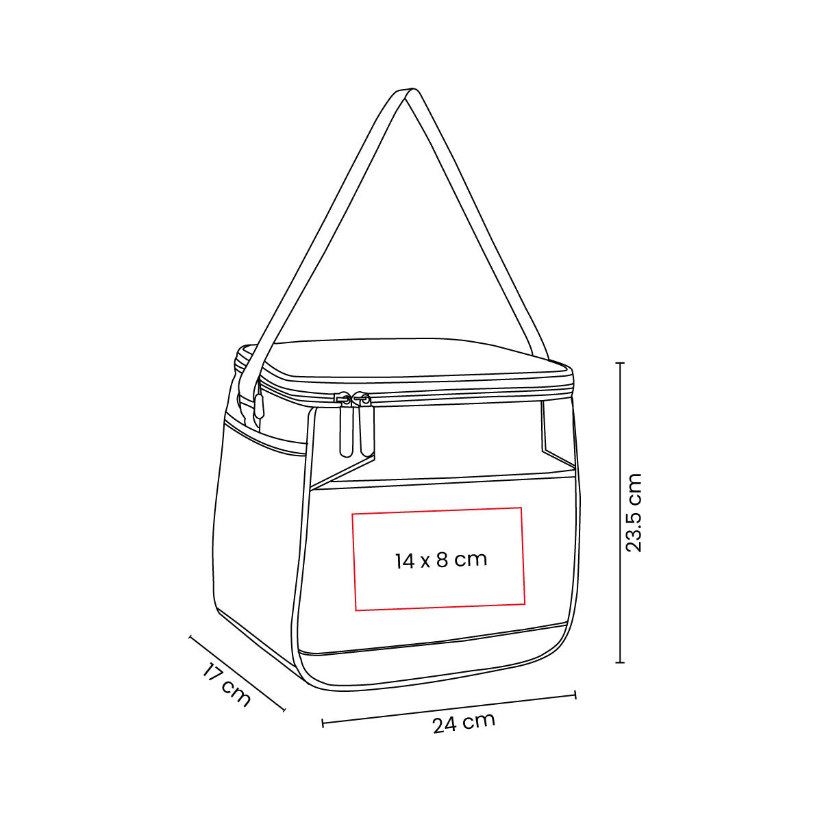 Interior plastificado. Bolsa frontal, bolsa principal con cierre, bolsa lateral de red y correa ajustable. Capacidad para 12 latas.