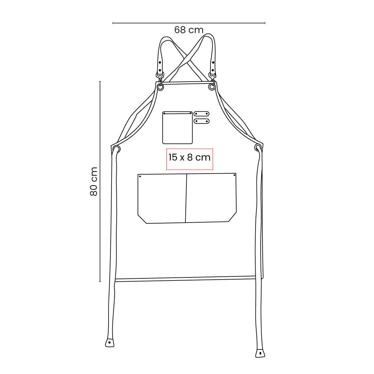 Incluye tres bolsillos frontales: uno en la parte superior, ideal para objetos pequeños, y dos en la parte inferior, perfectos para herramientas, utensilios o accesorios. Cuenta con tirantes ajustables con hebillas metálicas y remaches que aportan mayor resistencia y un toque de estilo. Su diseño cruzado en la espalda ofrece mayor comodidad. Elaborado para entornos de trabajo exigentes, desde cocinas industriales hasta talleres o espacios creativos.