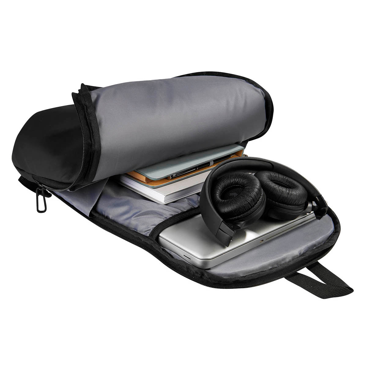 Bolsa principal con cierre y compartimento interior para laptop de hasta 15". Incluye bolsillo frontal superior y bolsillo frontal con cierre cruzado. En la parte posterior cuenta con tirantes para hombro ajustables, respaldo acolchado y banda que facilita su transporte en trolley.