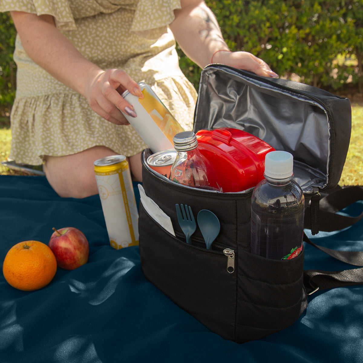 Lonchera tipo mochila con asas, su diseno versatil permite llevarla como una mochila, facilitando su transporte. Cuenta con un bolsillo principal con cierre, que permite guardar los alimentos de manera segura y organizada. Incluye un bolsillo frontal con cierre, ideal para llevar utensilios o articulos pequenos. Tambien cuenta con dos bolsillos laterales, adecuados para llevar botellas de agua u otros objetos de acceso rapido. Capacidad para 12 latas.