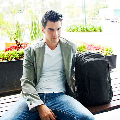 Bolsa principal con cierre y espacio para laptop de 15”. Bolsa central para tablet. Bolsa frontal con compartimentos para celular, bolígrafos y documentos. Bolsas laterales con cierre. Respaldo con cierre y porta celular interno. Respaldo y tirantes acojinados. Compartimento inferior con funda impermeable para la mochila. Incluye porta llaves.