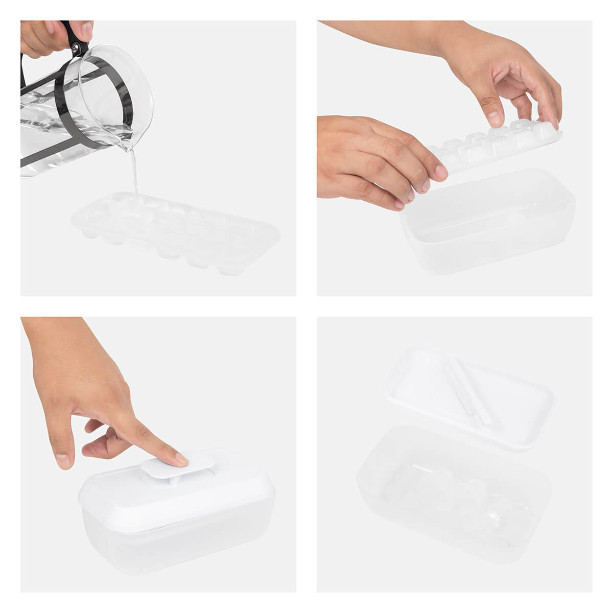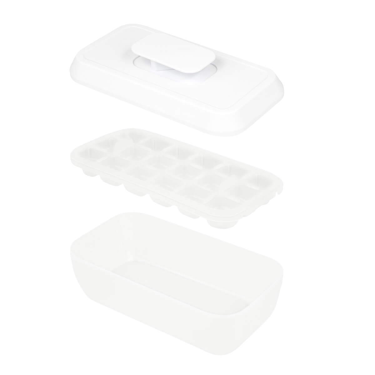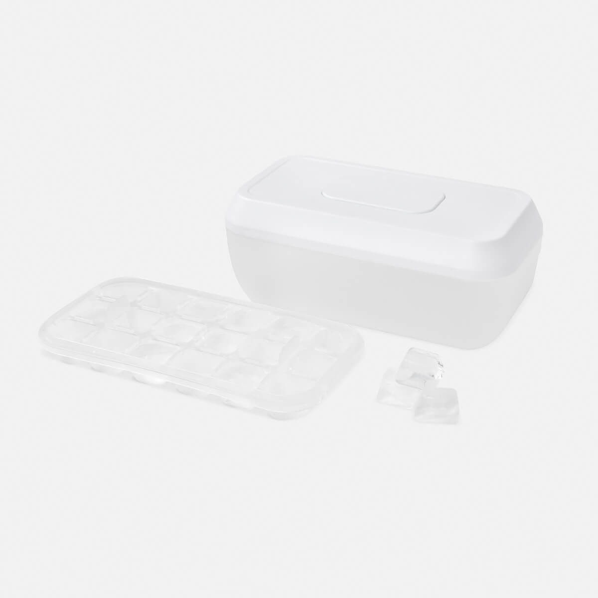 Molde para hielos con almacenamiento integrado. Crea hasta 18 cubitos y desmoldalos facilmente con el sistema push de la tapa. Gracias a su contenedor integrado, puedes almacenar el hielo listo para usar sin ocupar espacio extra.