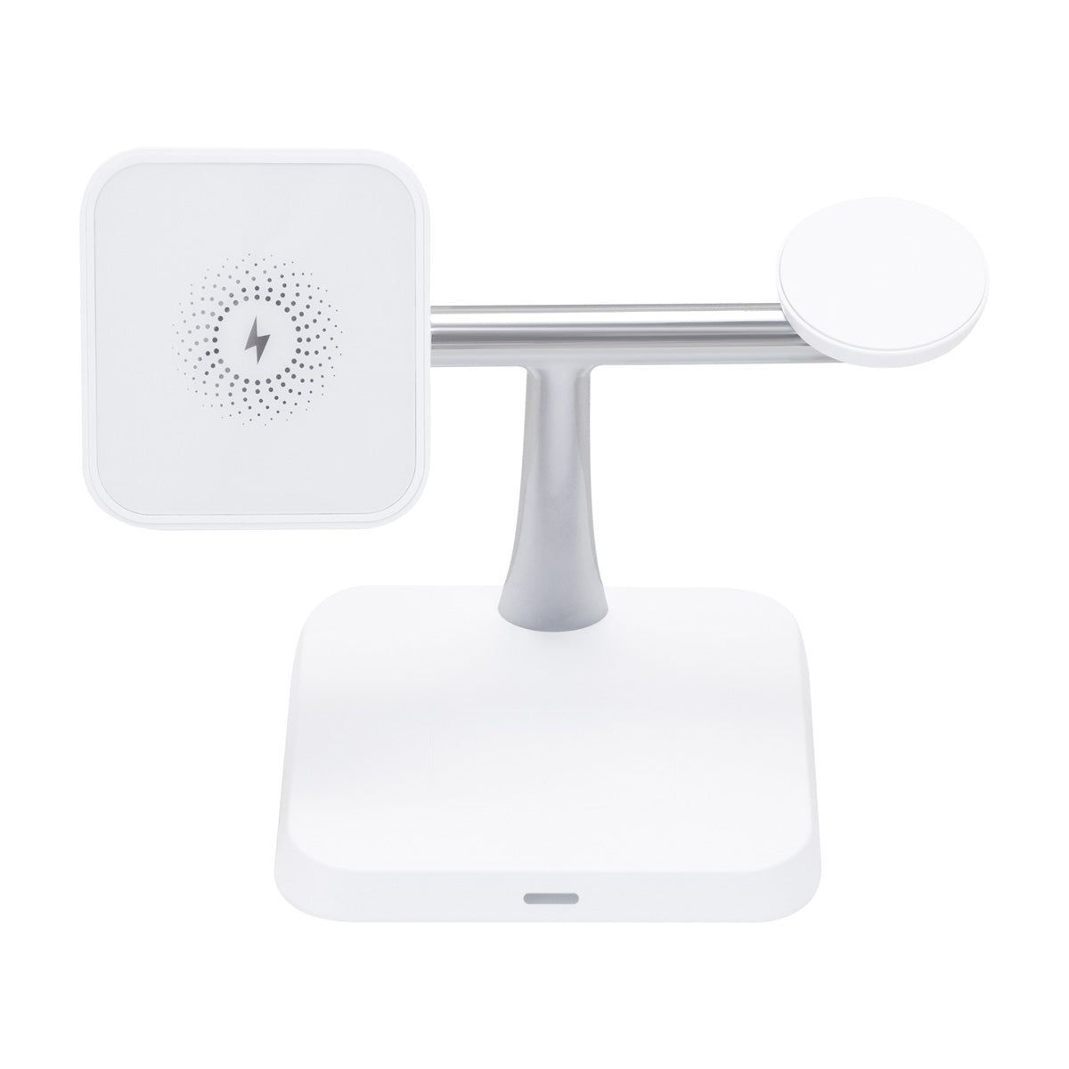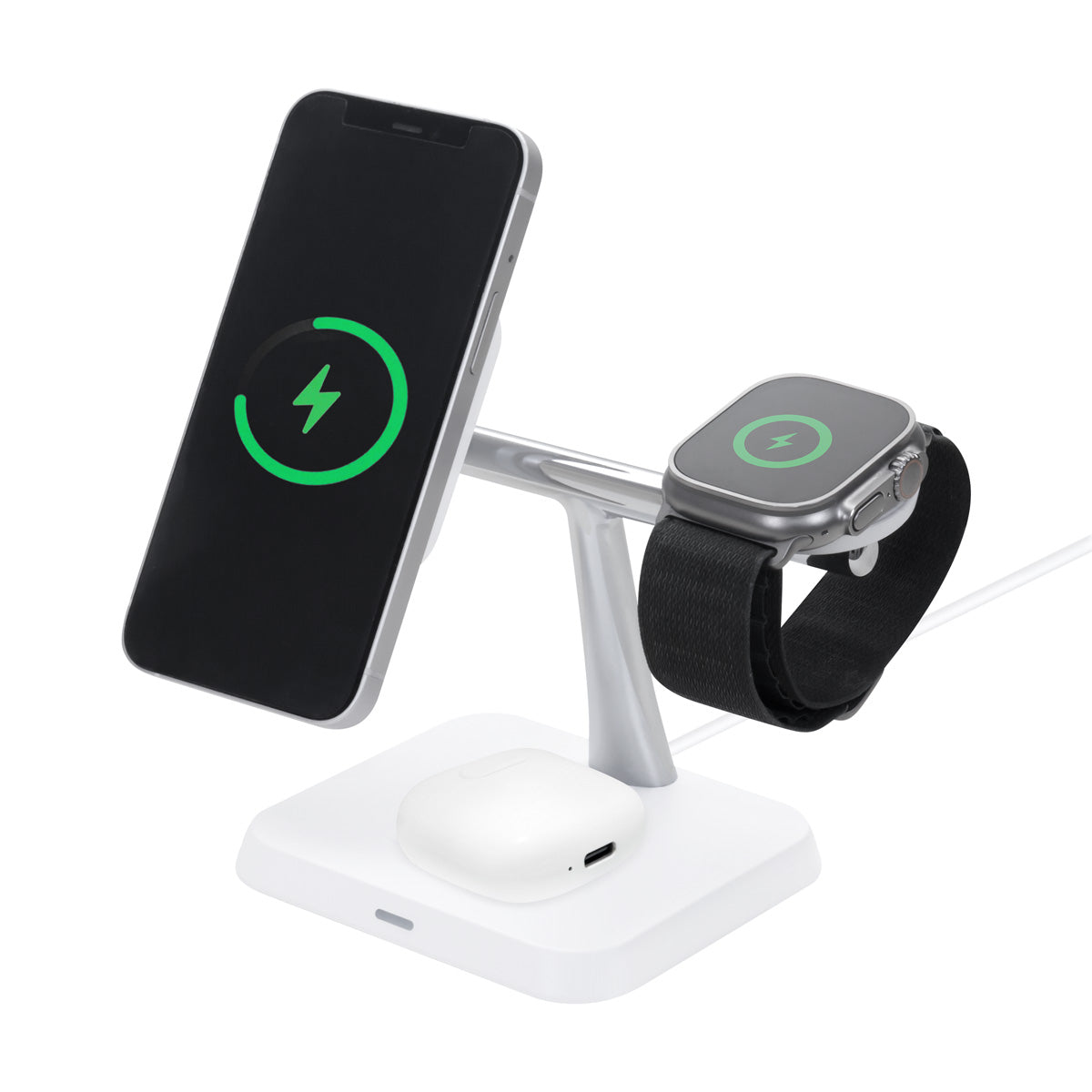 Estación de carga inalámbrica 3 en 1. Permite la carga simultanea de smartphone, earbuds y reloj inteligente. Velocidad de carga de 15 W / 5W / 3W. Incluye cable de 1m con conector tipo C y caja individual. Compatible con dispositivos que cuenten con tecnología de carga inalámbrica.