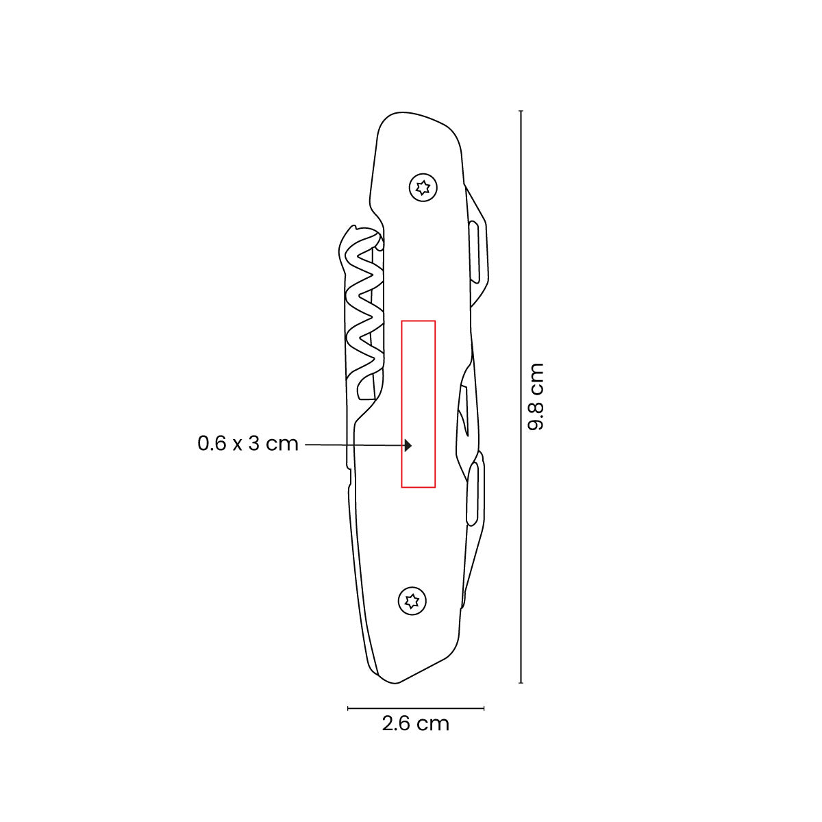 Navaja metalica con 12 funciones. Incluye 1 navaja, 1 destornillador, 1 destornillador plano, 1 destornillador pequeno, 1 abrelatas, 1 lima, 1 sacacorchos, 1 guia de hilo, 1 punzon para cuero, 1 cortador de cajas, 1 destapador y 1 cuchilla pequena. Incluye caja individual.