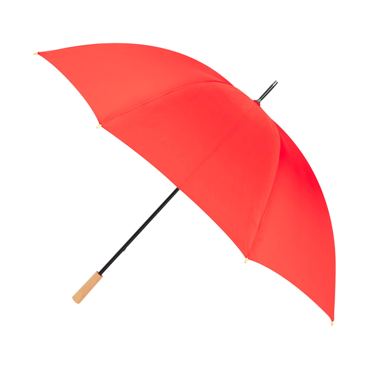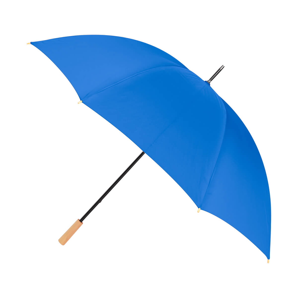 Paraguas de 8 paneles con apertura automática. fabricado en plástico reciclado (RPET). Cuenta con mango y punteras de madera. Incluye funda protectora.