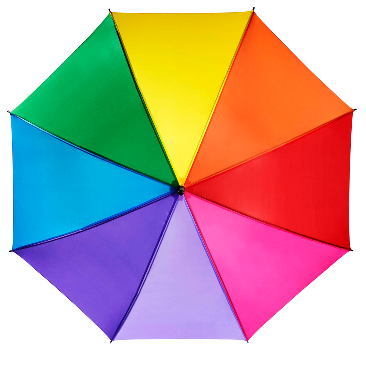 Paraguas de 8 paneles, cada panel de un color. Sistema manual. Mango de esponja. Su diseño arcoíris, colorido y alegre refleja la diversidad y la inclusividad.
