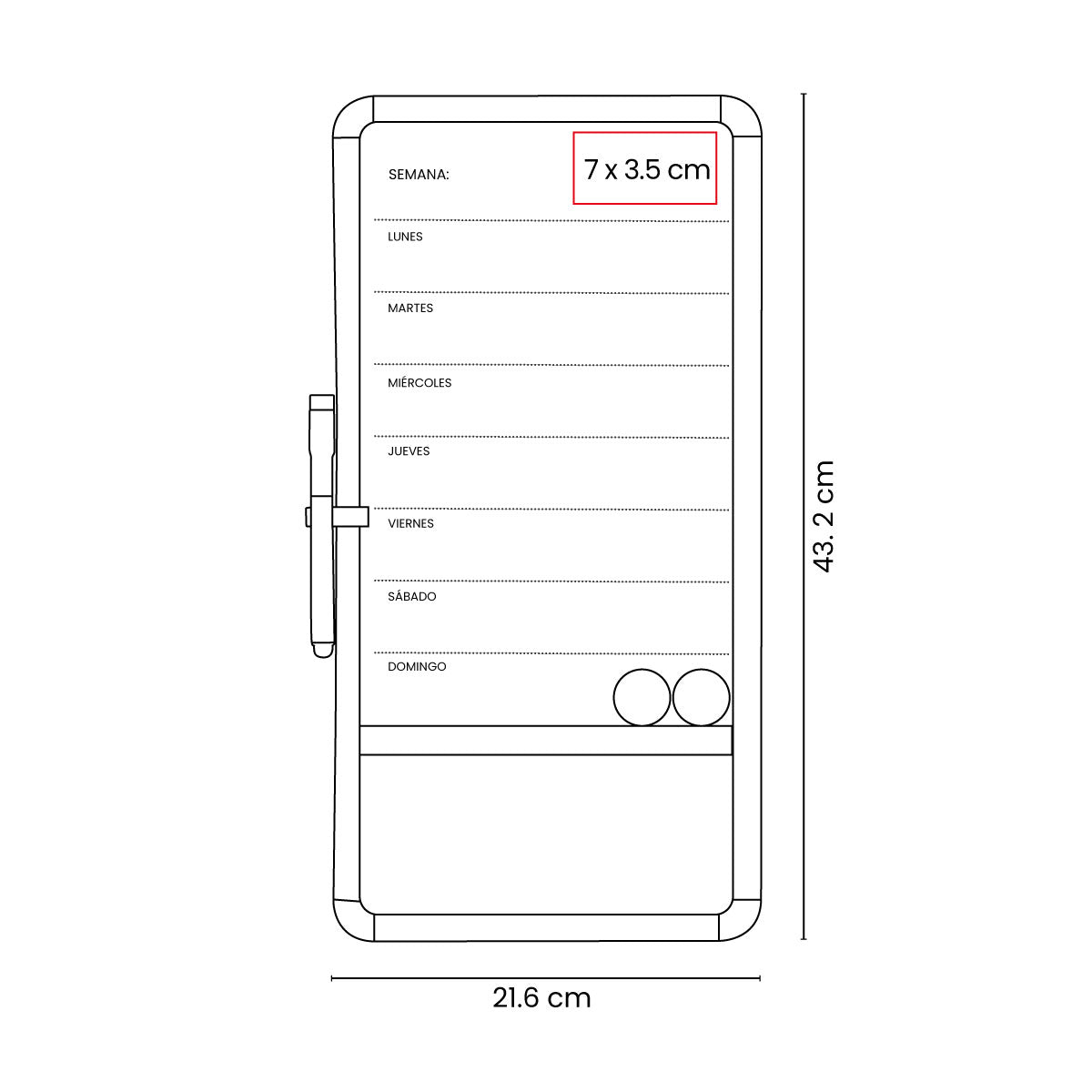 Pintarron con planeador semanal ideal para organizar tus tareas mas importantes. Incluye marcador en color negro con borrador. Superficie magnetica para sujetar notas, mientras que la parte inferior cuenta con una seccion de corcho para colocar papeles o documentos. Gracias a su gancho en la parte superior, este pintarron es facil de colgar. Incluye dos imanes adhesivos para fijar en la pared.